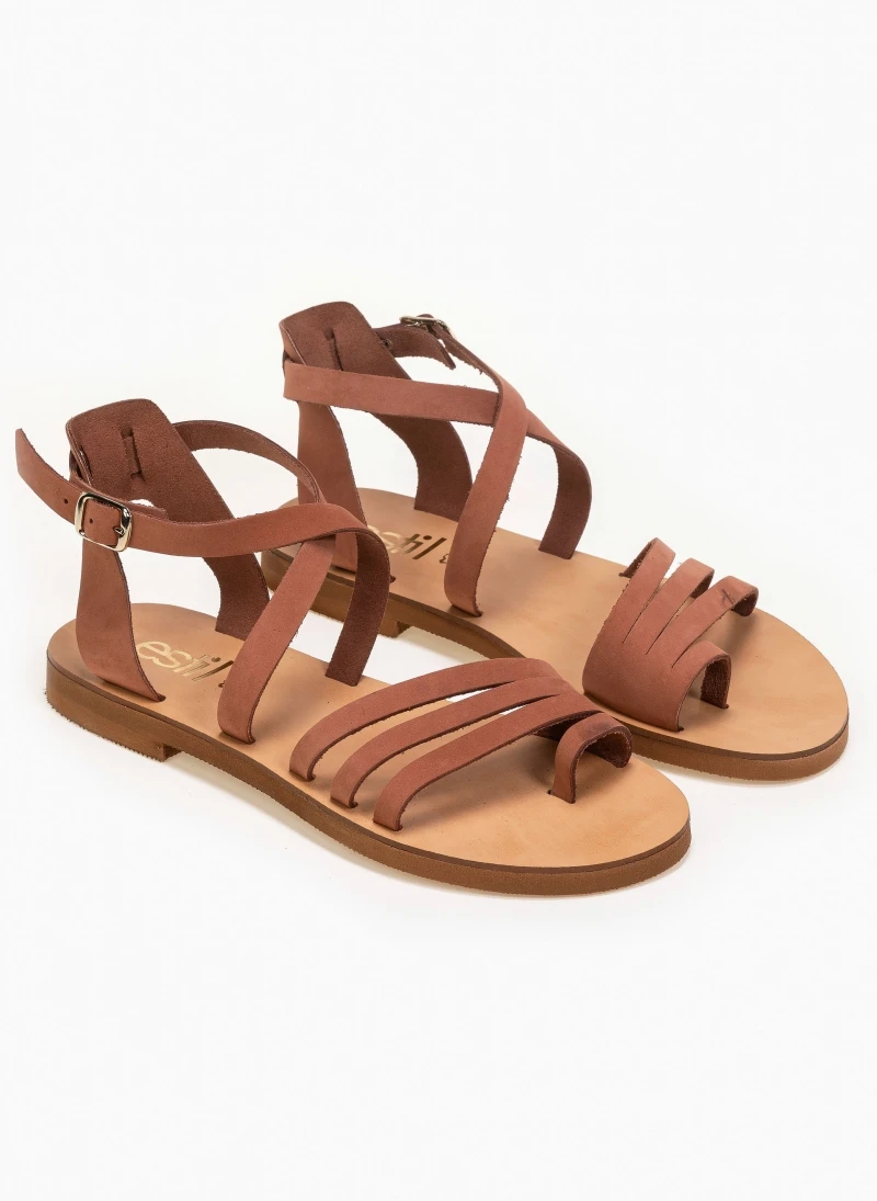 Estil nubuck ίσια πέδιλα με τριπλό λουράκι. Έχουν χιαστί δέσιμο στο ύψος του αστραγάλου. Ελληνικής κατασκευής, χειροποίητα.