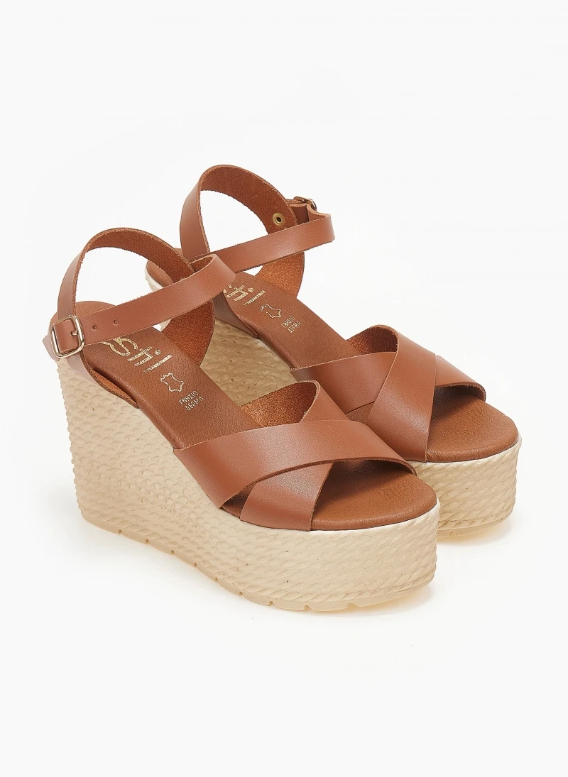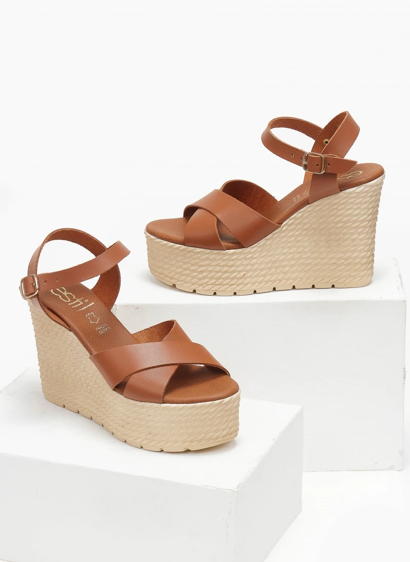 Πλατφόρμες δερμάτινες estil. ΄’Εχουν χιαστί φάσες και μπαρέτα με δέσιμο στο πλάι. Δερμάτινος πάτος. Ελληνικής κατασκευής.