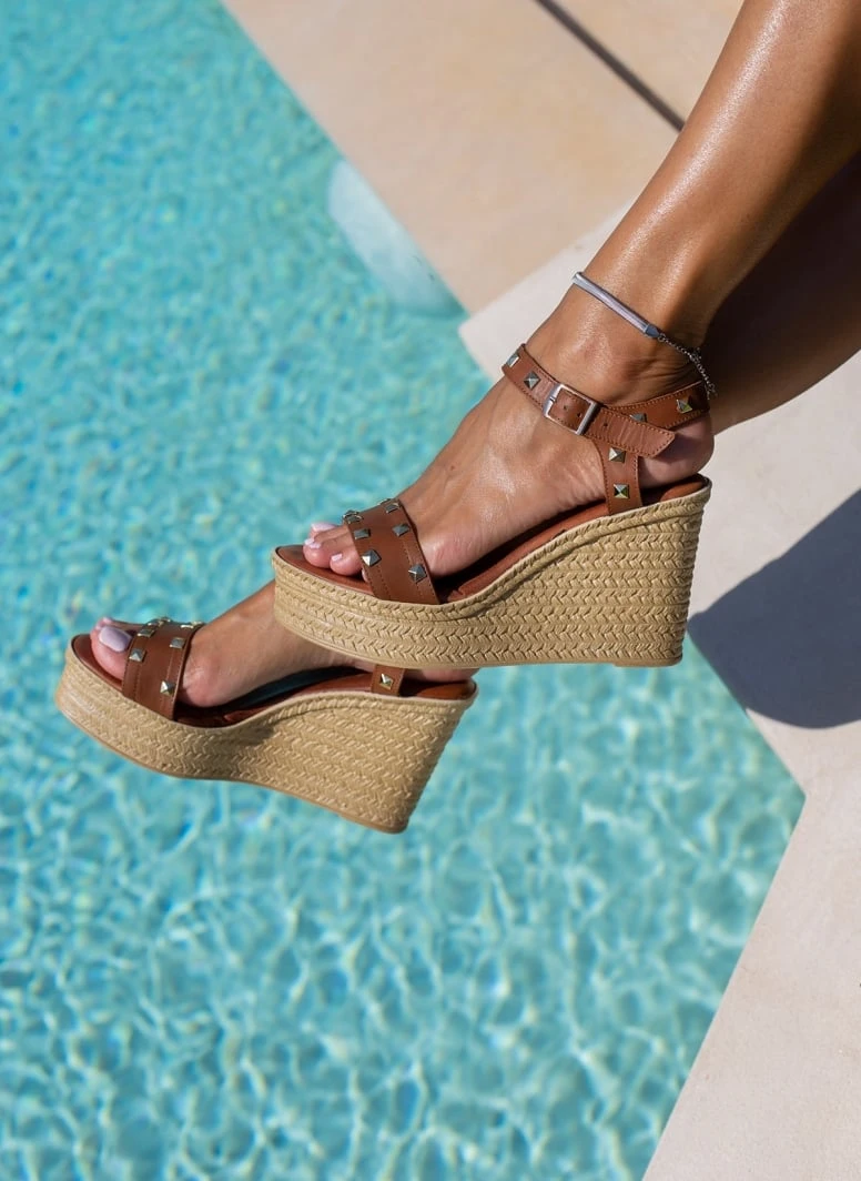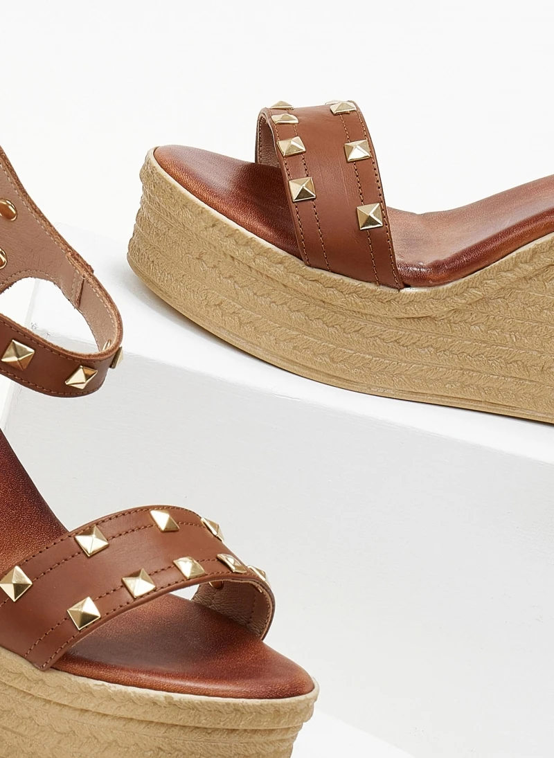 Πλατφόρμες δερμάτινες ESTIL με μεταλλικά τρουκς. Δένουν με μπαρέτα στο ύψος του κουτεπιέ. Δερμάτινος πάτος με ενίσχυση. Ελληνικής κατασκευής.