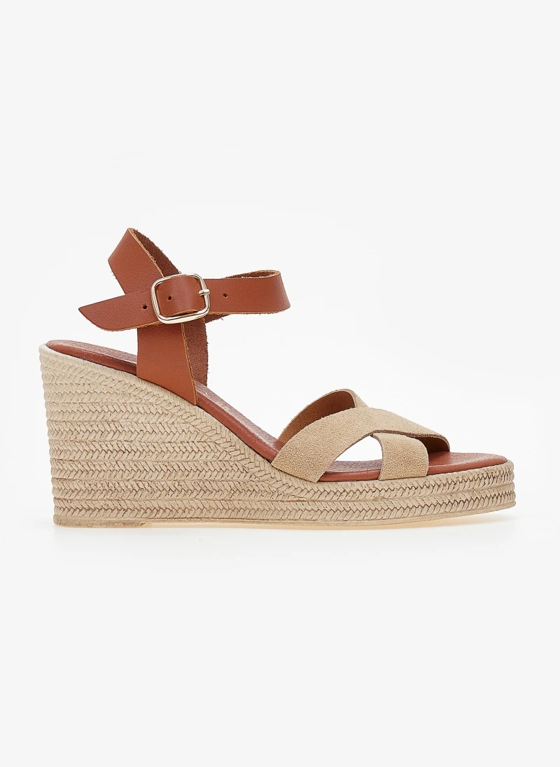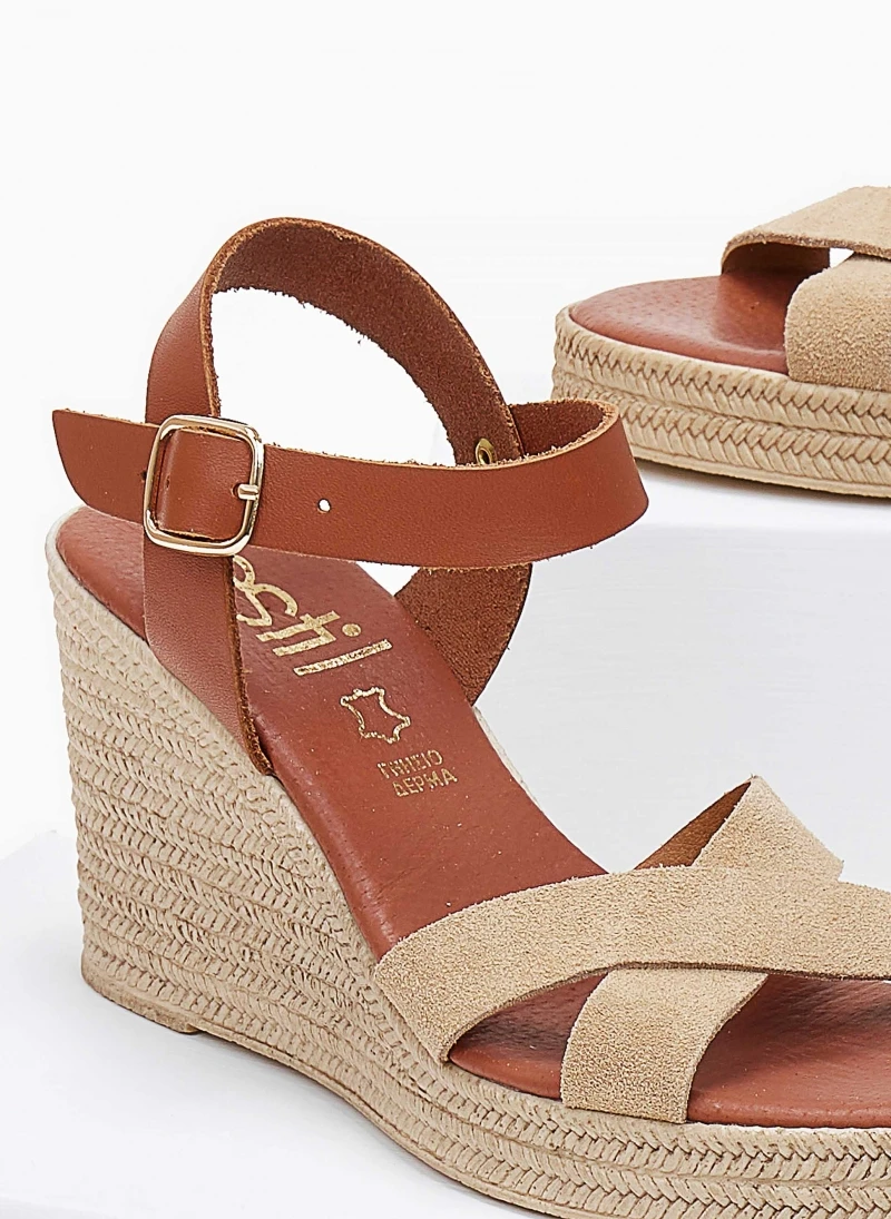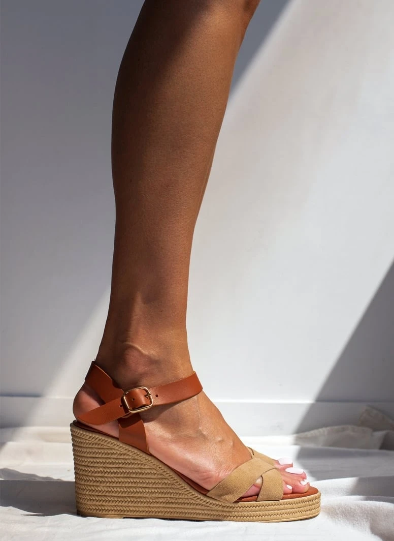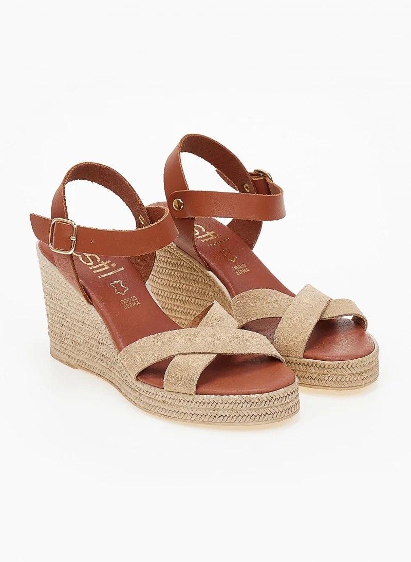 Estil δερμάτινες πλατφόρμες. Έχουν μαλακό δερμάτινο πάτο με ενίσχυση και ελαφριά σόλα. Δένουν με μπαρέτα στο ύψος του κουτεπιέ. Το μπροστά μέρος είναι χιαστί. Ελληνικής κατασκευής.