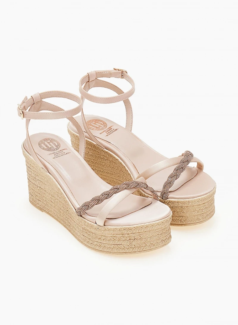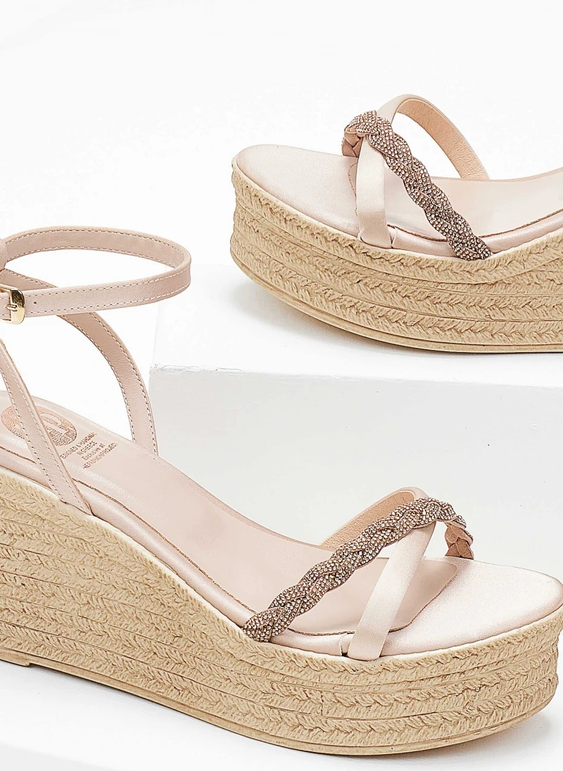 Πλατφόρμες σατέν TFP με strass κοτσιδάκι. Δένουν με μπαρέτα στο ύψος του αστραγάλου. Ελληνικής κατασκευής.