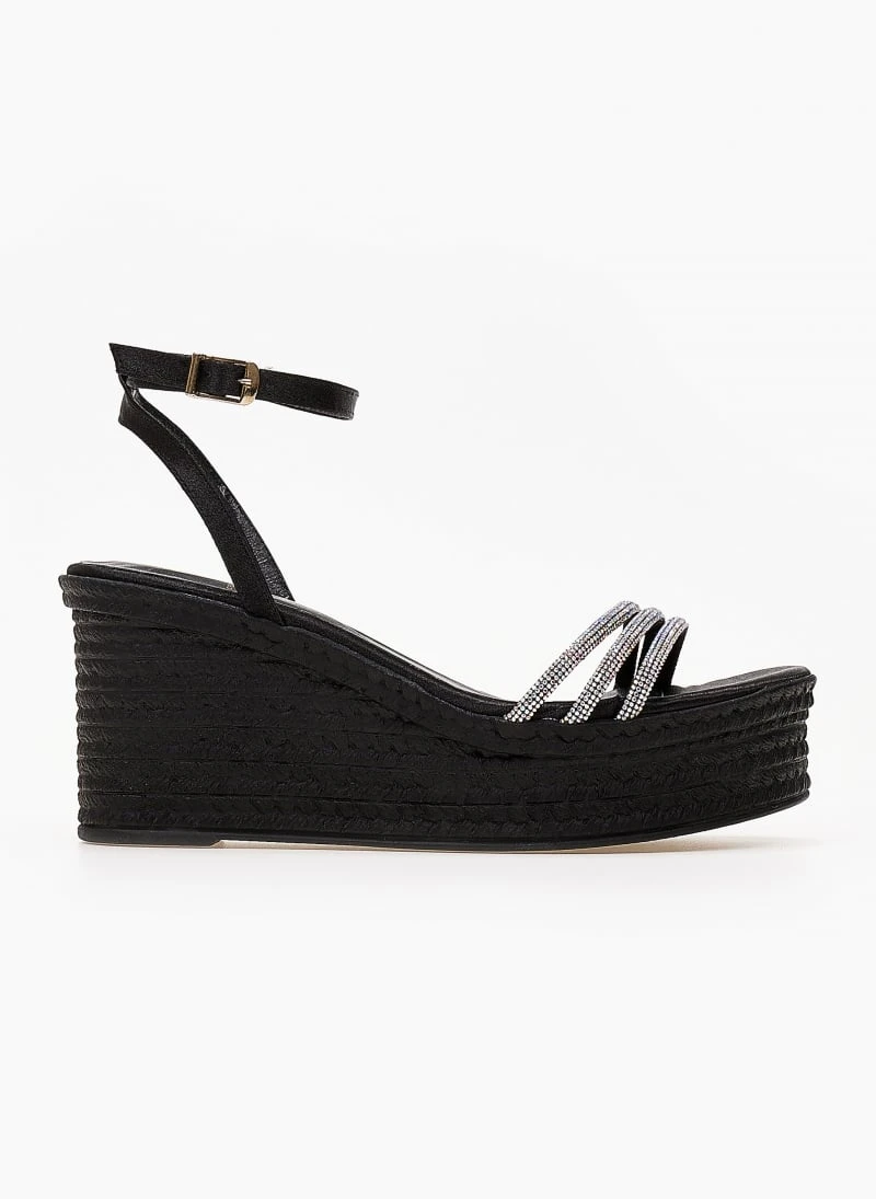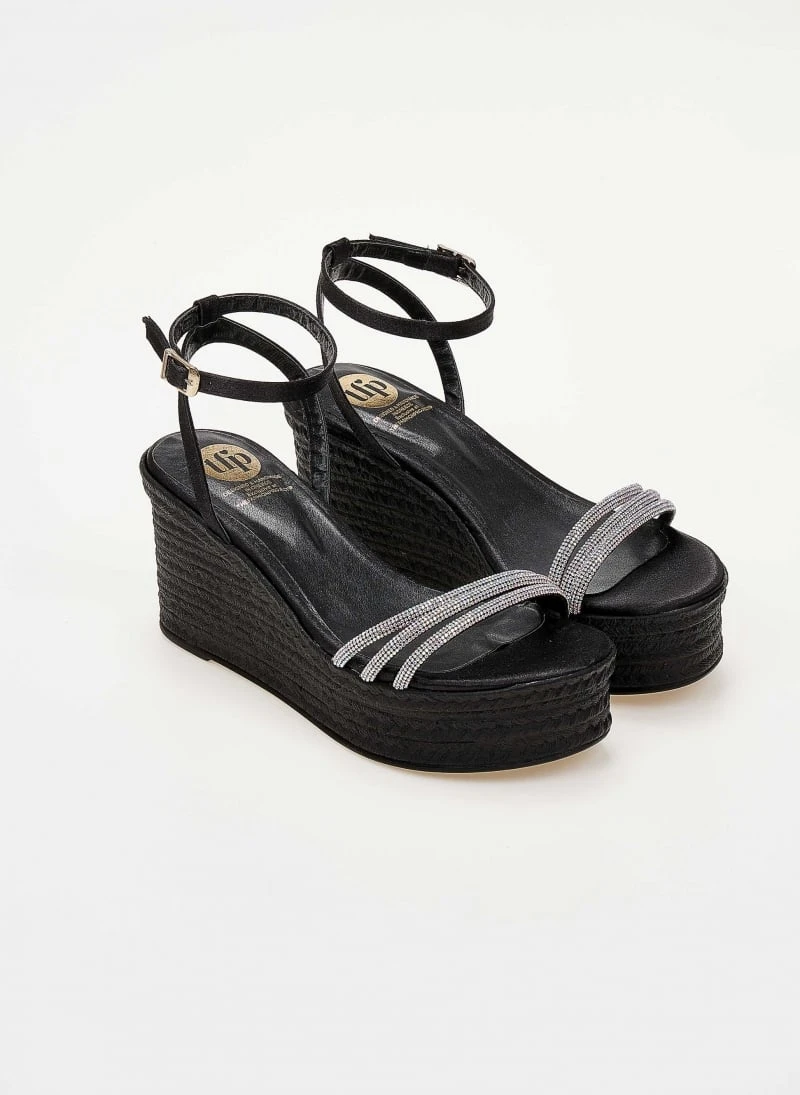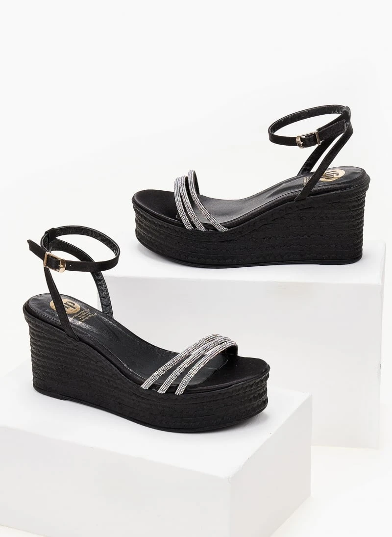 Πλατφόρμες TFP με λεπτά strass λουράκια. Δένουν με μπαρέτα στο ύψος του αστραγάλου. Ελληνικής κατασκευής.