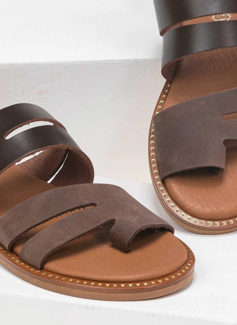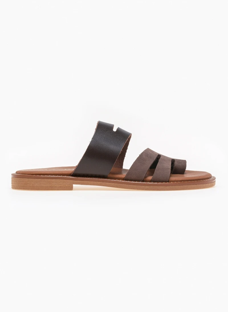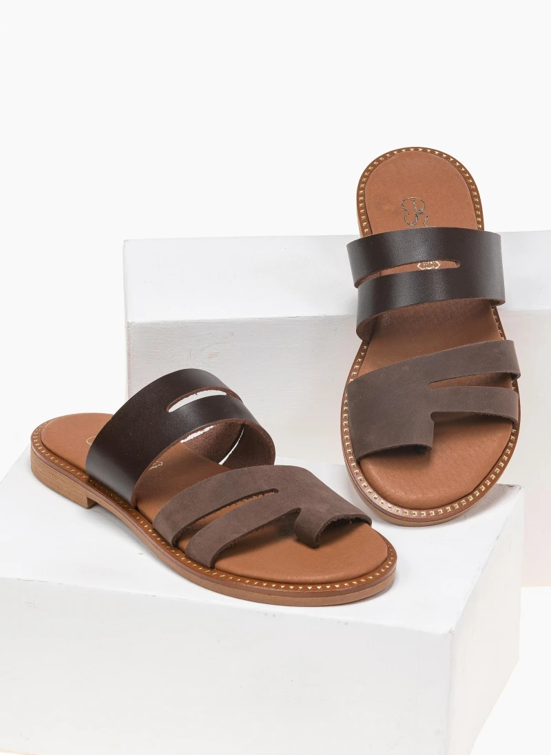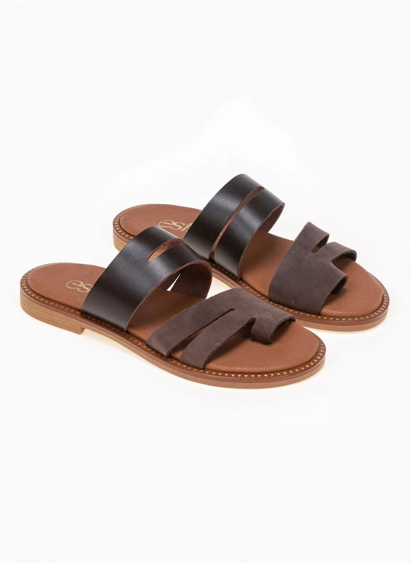 Estil δερμάτινα σανδάλια με δύο φάσες και ανοίγματα στο πλάι. Ο πάτος είναι δερμάτινος με ενίσχυση. Συνδυάζουν ματ και nubuck δέρμα. Έχουν λεπτομέρεια μεταλλικό χρώμα περιμετρικά της σόλας. Ελληνικής κατασκευής, χειροποίητα.