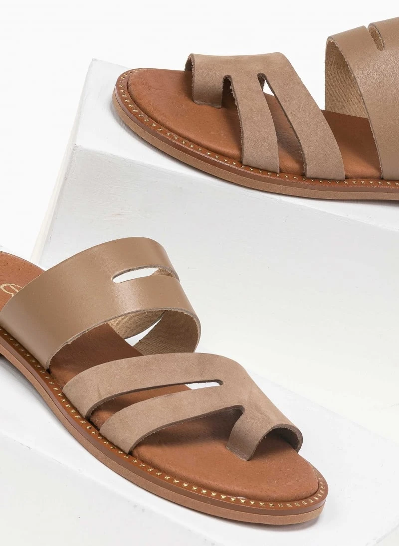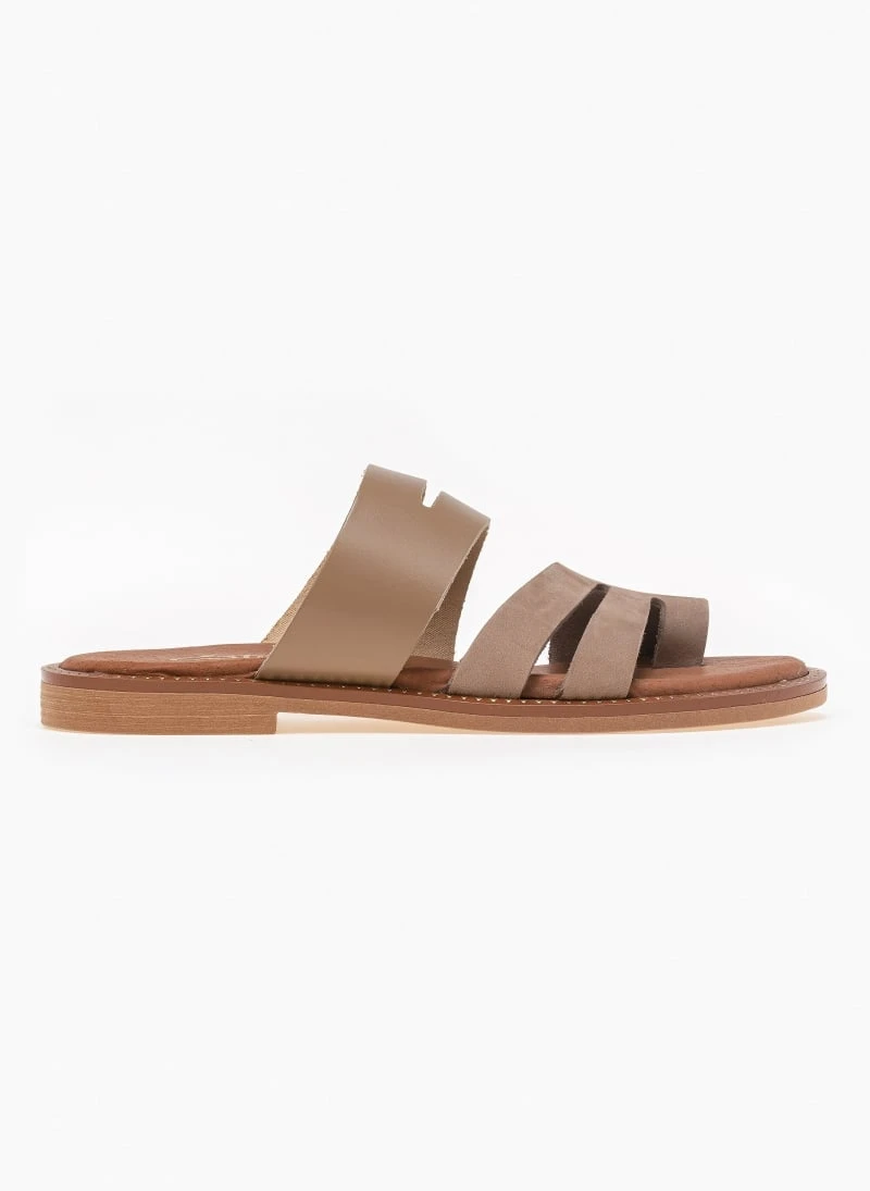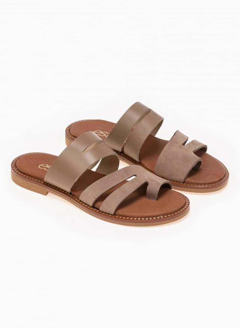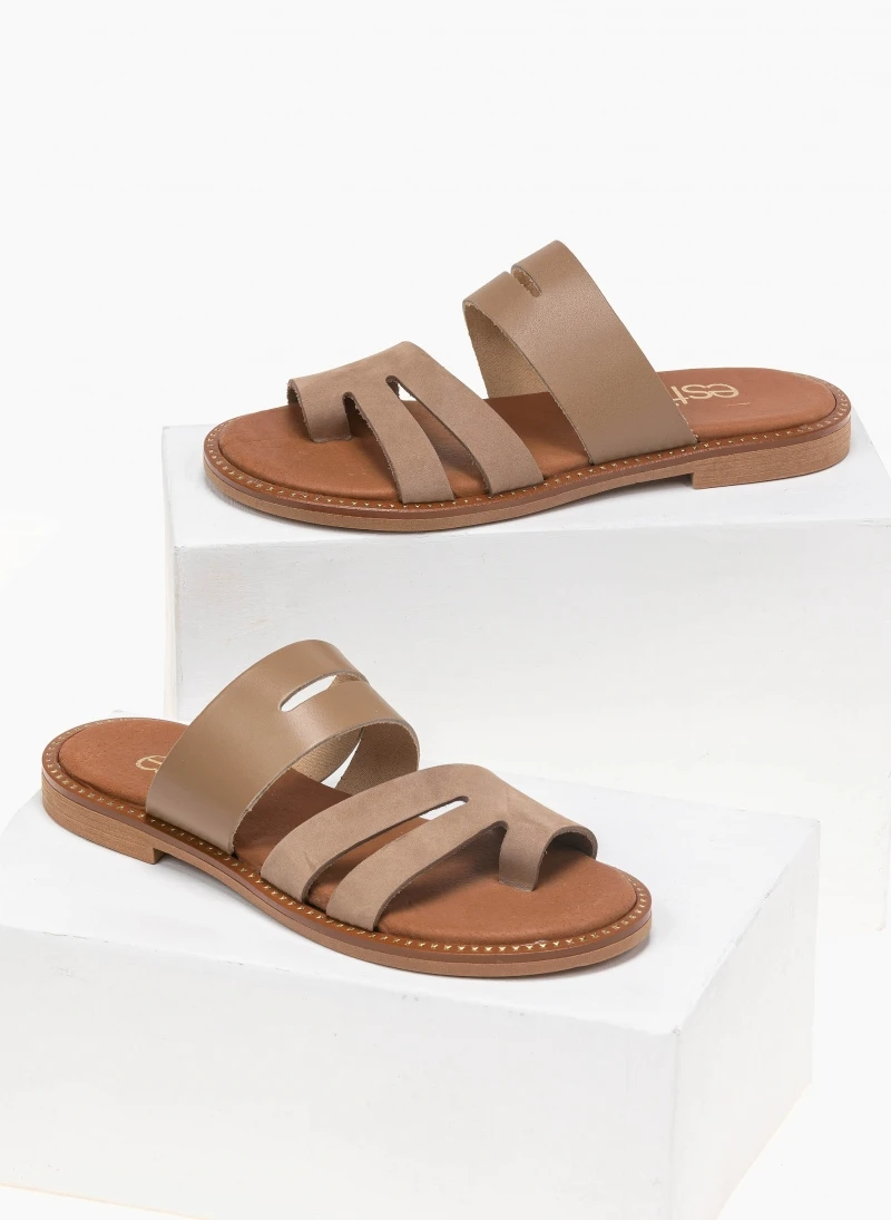 Estil δερμάτινα σανδάλια με δύο φάσες και ανοίγματα στο πλάι. Ο πάτος είναι δερμάτινος με ενίσχυση. Συνδυάζουν ματ και nubuck δέρμα. Έχουν λεπτομέρεια μεταλλικό χρώμα περιμετρικά της σόλας. Ελληνικής κατασκευής, χειροποίητα.