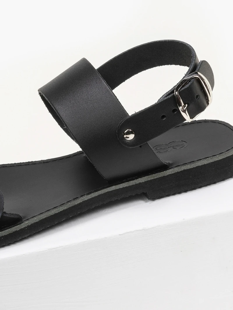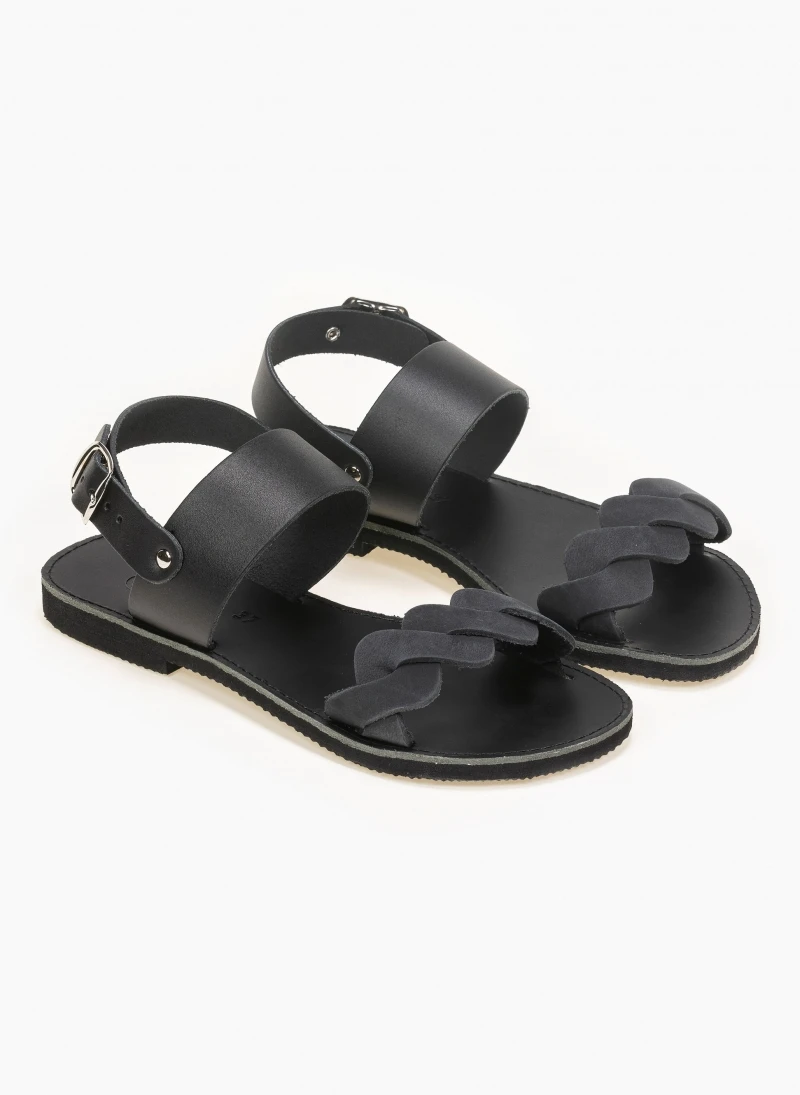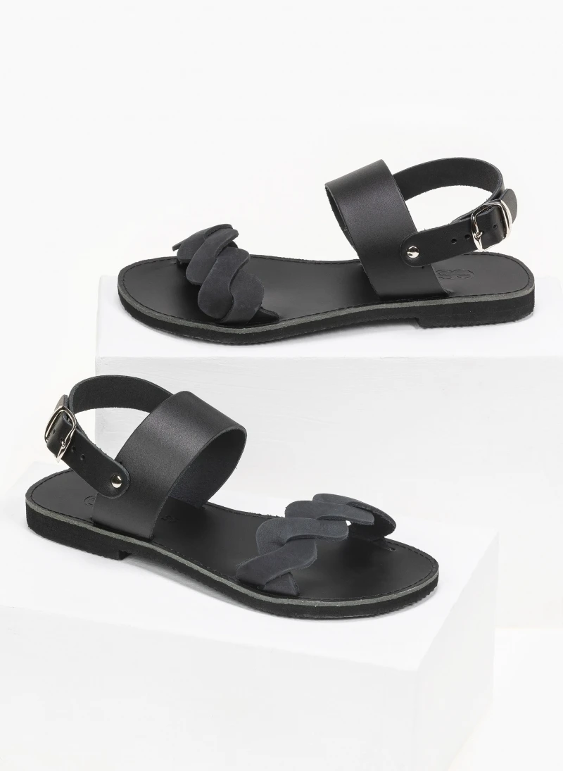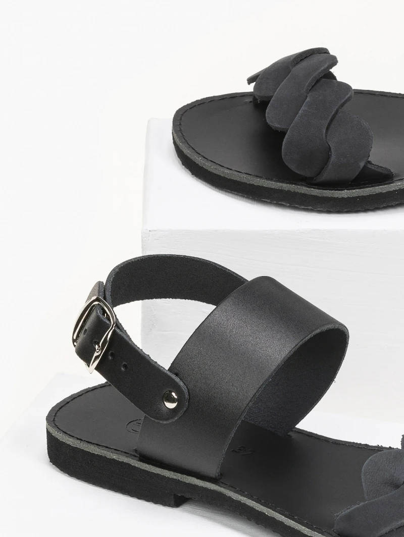 Estil δερμάτινα ίσια πέδιλα. Έχουν διπλό λουράκι από nubuck δέρμα. Δένουν στο πλάι. Ελληνικής κατασκευής, χειροποίητα.