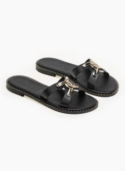 Δερμάτινα σανδάλια με χιαστί λουράκια και μεταλλική αγκράφα. Έχουν λεπτομέρεια σε μεταλλικό χρώμα περιμετρικά της σόλας. Ο πάτος είναι δερμάτινος. Ελληνικής κατασκευής, χειροποίητα.