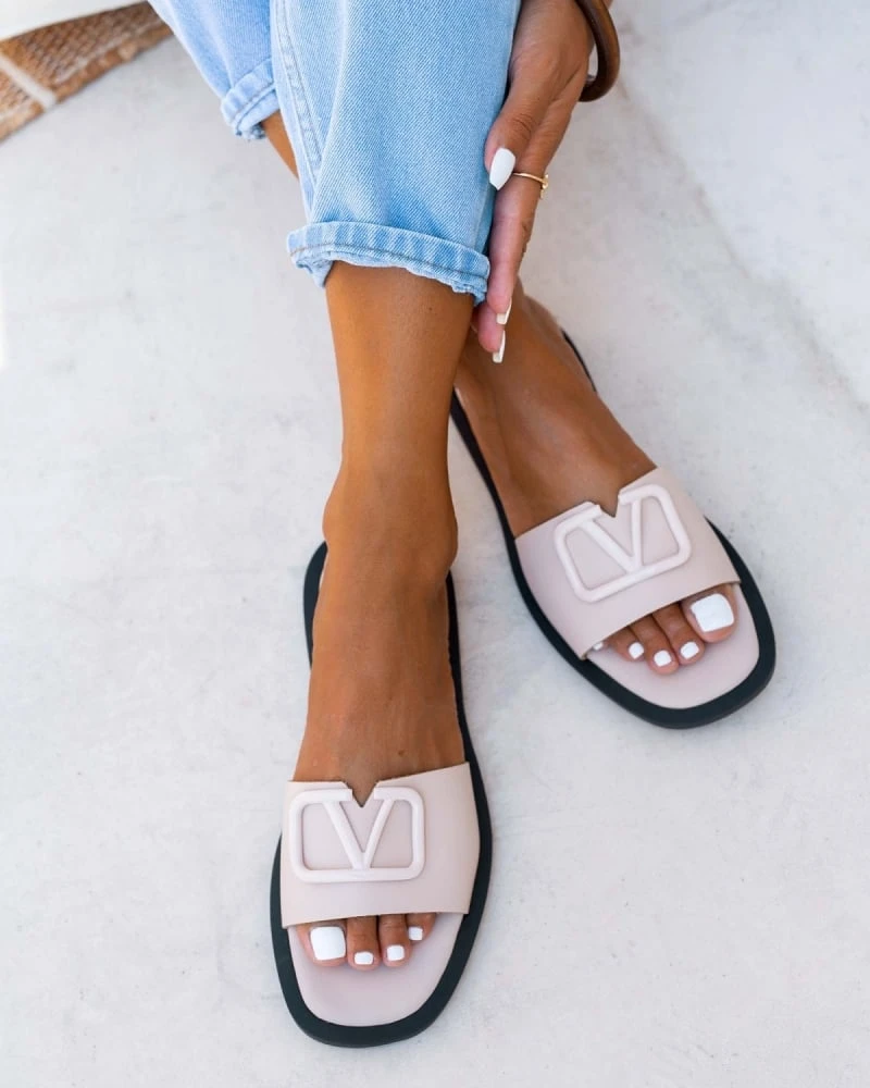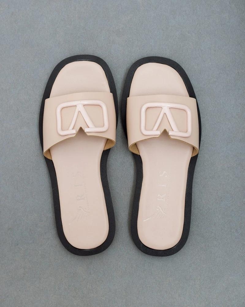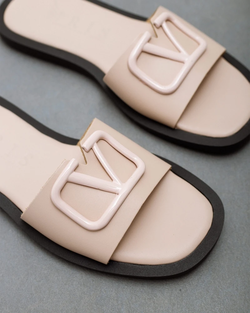 Δερμάτινα ίσια πέδιλα με φαρδιά φάσα και μεταλλική αγκράφα. Ο πάτος έχει ενίσχυση. Μαλακή σόλα σε καρέ γραμμή. Ελληνικής κατασκευής.