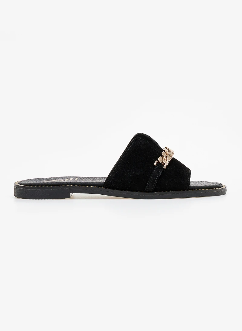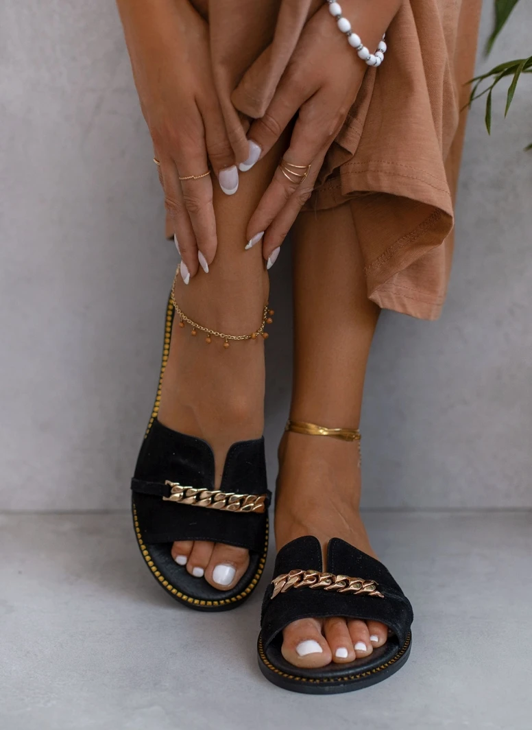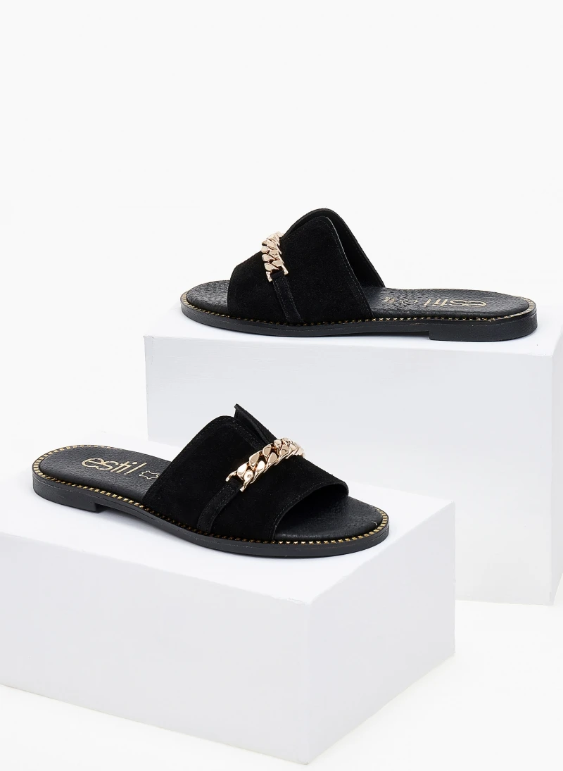 Estil καστόρινα σανδάλια με άνοιγμα και αλυσίδα στη φάσα. Ο πάτος είναι δερμάτινος με ενίσχυση. Ελληνικής κατασκευής.