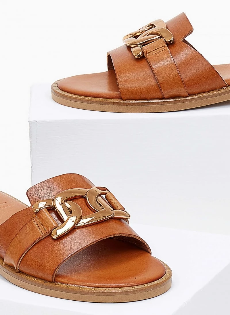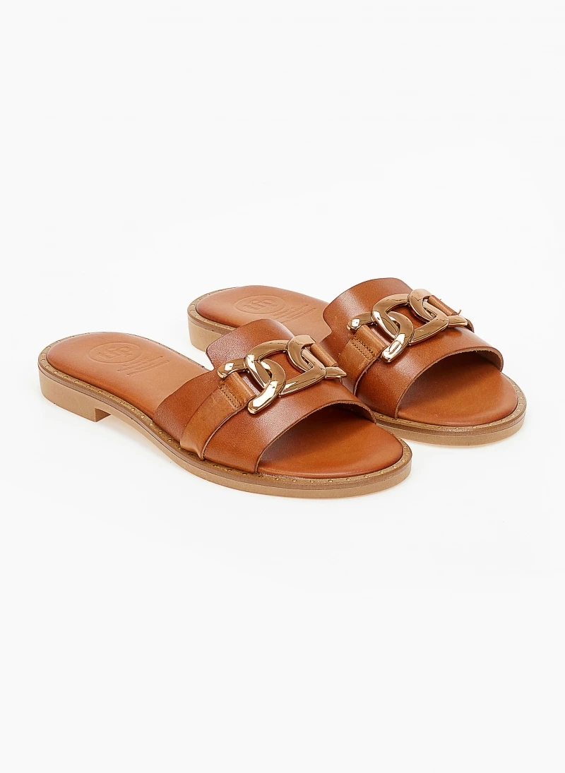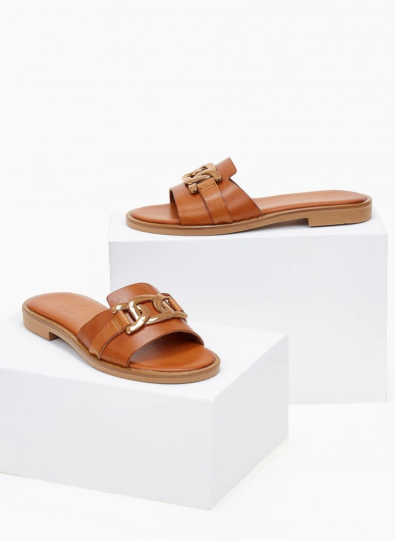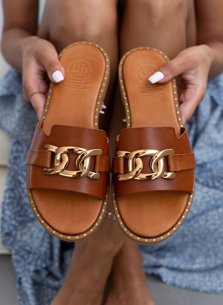 TFP σανδάλια δερμάτινα. Έχουν χρυσή αλυσίδα στη φάσα. O πάτος είναι δερμάτινος με ενίσχυση και λεπτομέρεια με χρυσό χρώμα περιμετρικά της σόλας. Ελληνικής κατασκευής, χειροποίητα.