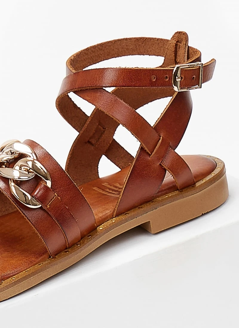 Σανδάλια δερμάτινα TFP με αλυσίδα στη φάσα. Δένουν με χιαστί λουράκι στο ύψος του αστραγάλου. Λεπτομέρεια μικρά μεταλλικά τρουκς περιμετρικά της σόλας. Μαλακός πάτος με ενίσχυση. Ελληνικής κατασκευής.