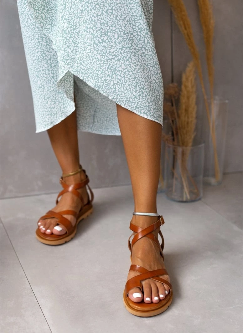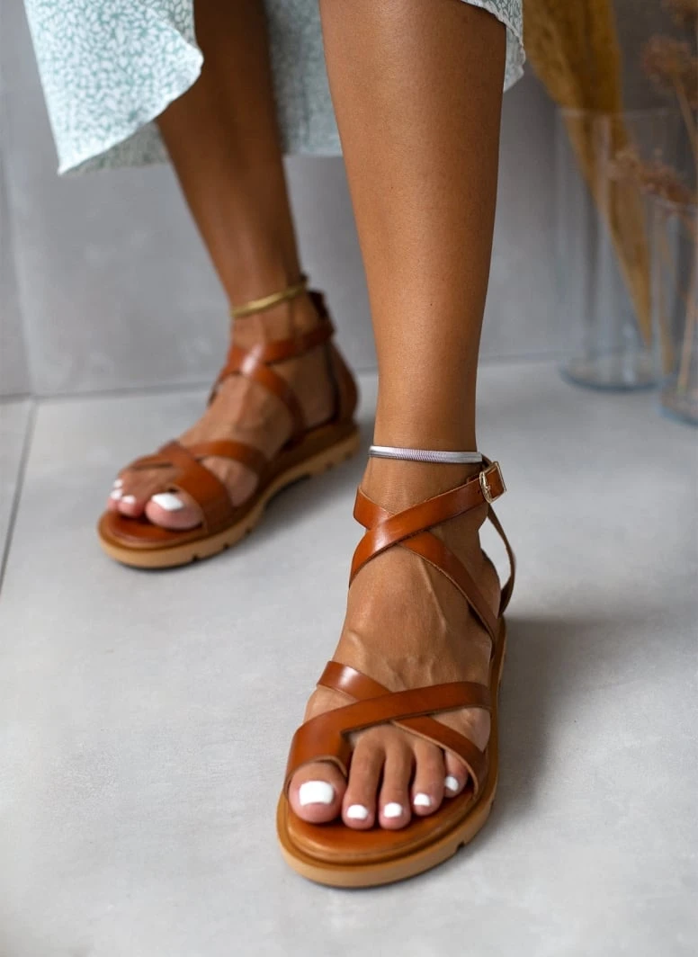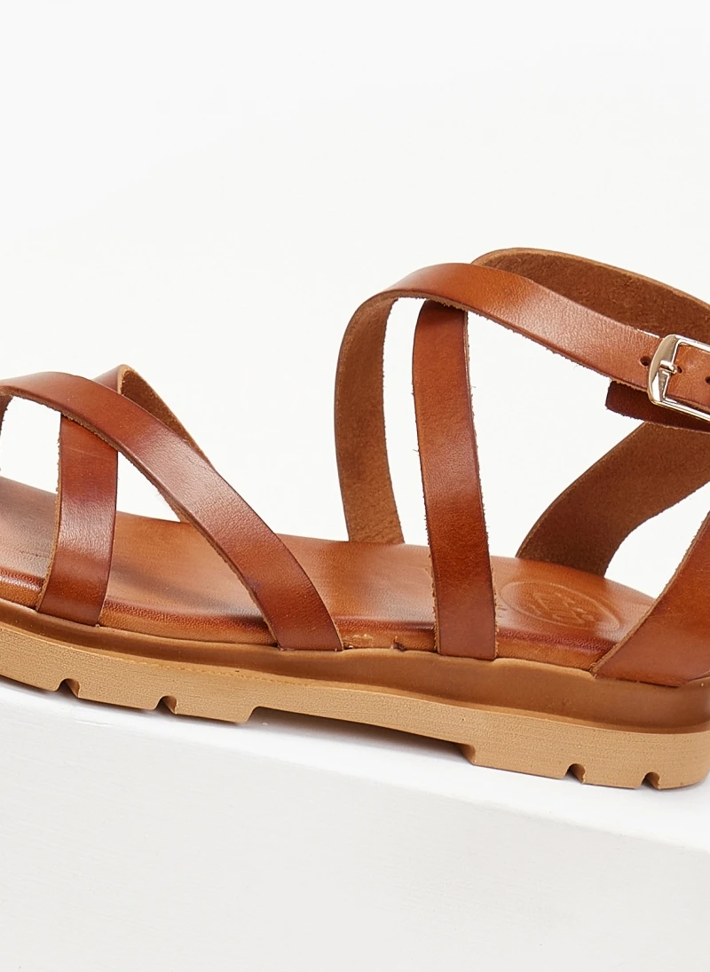 Σανδάλια δερμάτινα TFP με φάσες χιαστί. Δένουν στο ύψος του αστραγάλου. Ανατομική soft σόλα. Έχουν τρακτερωτό σχέδιο στη σόλα. Δερμάτινος πάτος με ανατομική ενίσχυση. Ελληνικής κατασκευής.