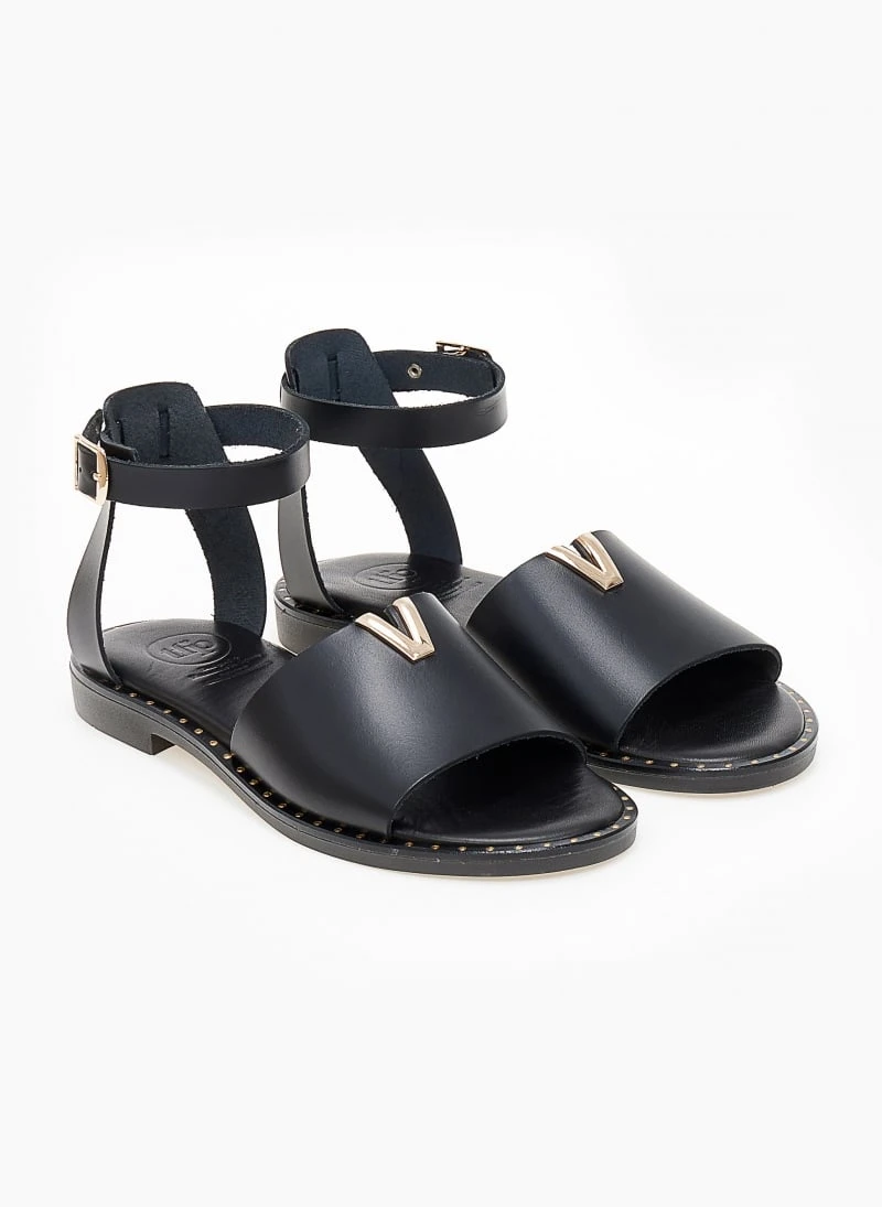 TFP δερμάτινα σανδάλια με V σχέδιο στη φάσα. Δένουν στον αστράγαλο. Έχουν μαλακό δερμάτινο πάτο με ενίσχυση. Ελληνικής κατασκευής.