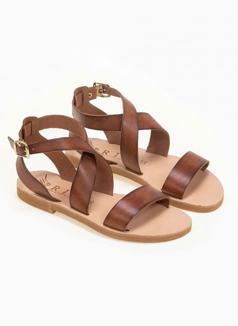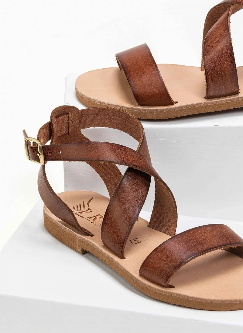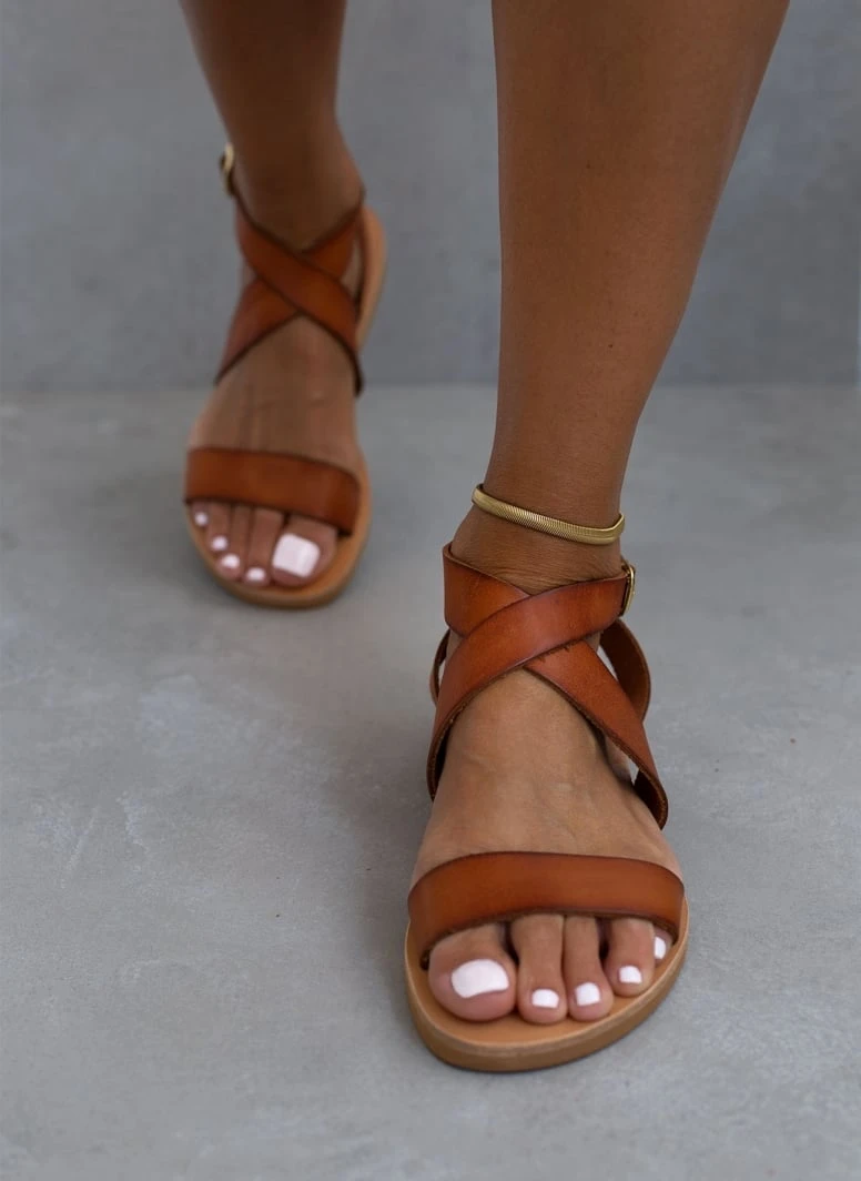 Χειροποίητα δερμάτινα ίσια πέδιλα. Δένουν με χιαστί λουράκια στο ύψος του κουτεπιέ. Ελληνικής κατασκευής.