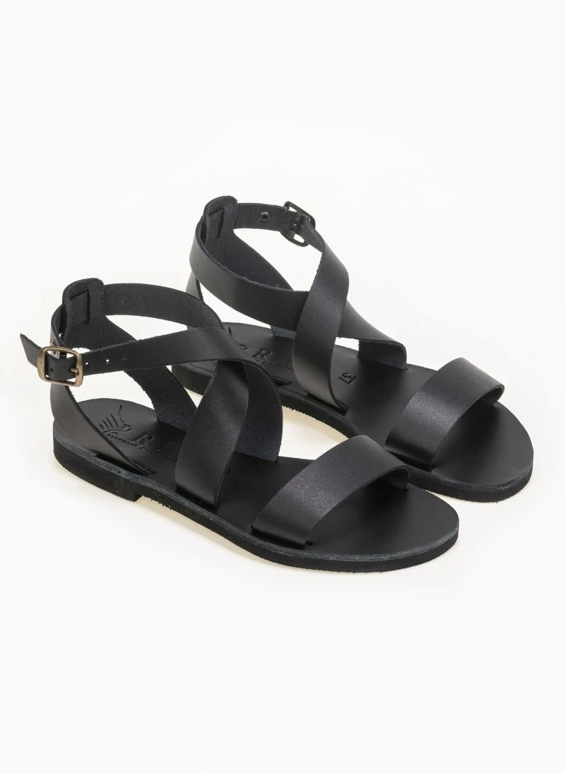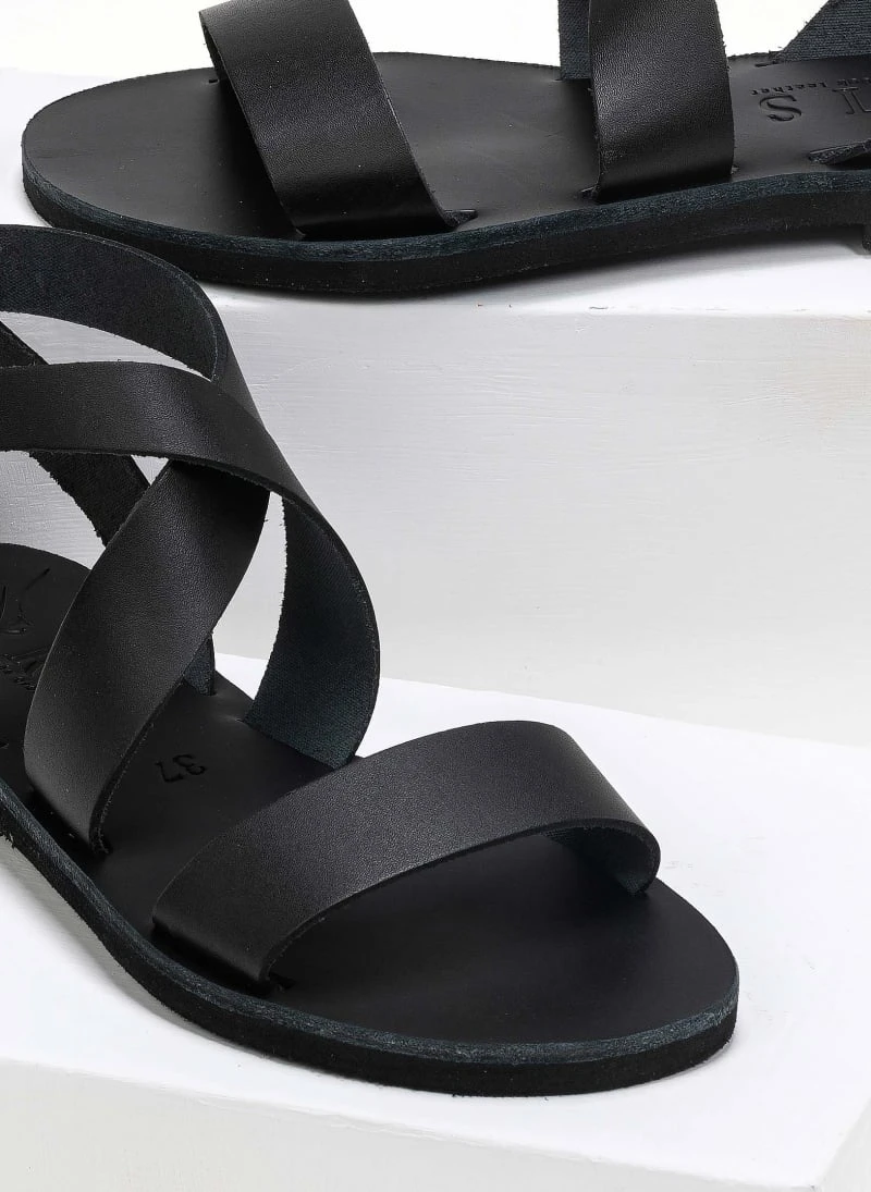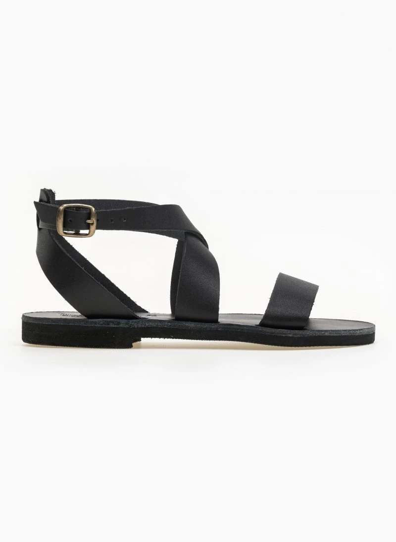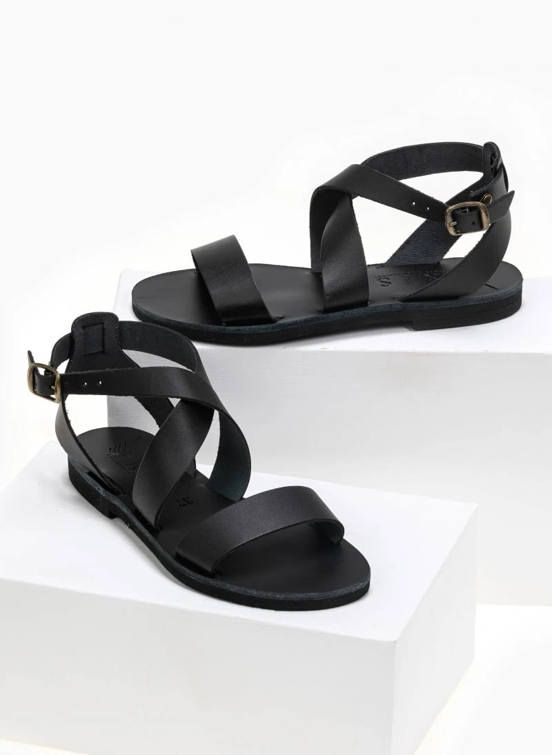 Χειροποίητα δερμάτινα ίσια πέδιλα. Δένουν με χιαστί λουράκια στο ύψος του κουτεπιέ. Ελληνικής κατασκευής.