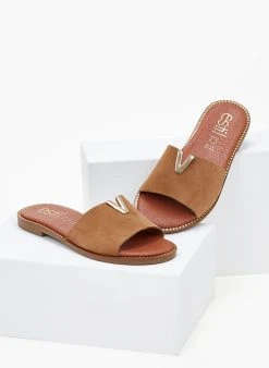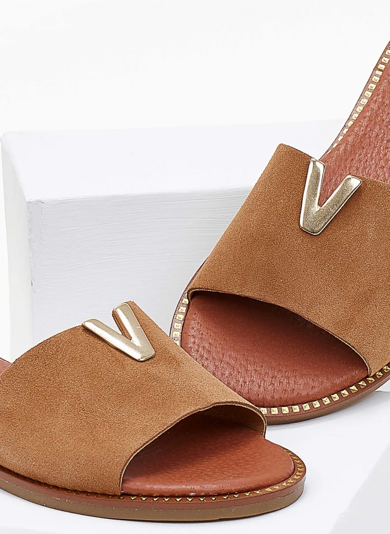 Σανδάλια δερμάτινα Estil. Έχουν χοντρή φάσα από καστόρι και διακοσμητική αγκράφα στο πάνω μέρος. Με μαλακή δερμάτινη σόλα με χρυσό σχέδιο περιμετρικά. Ελληνικής κατασκευής.