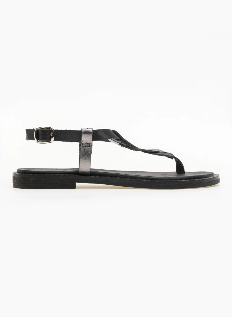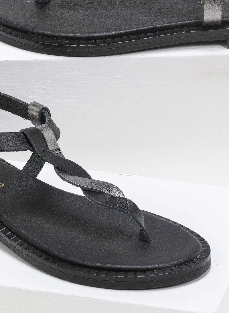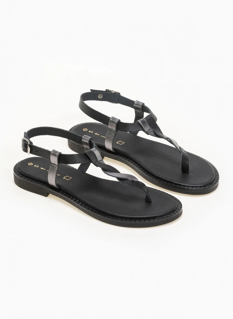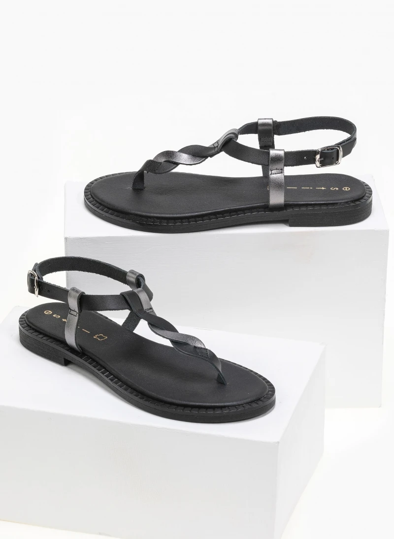 Estil δερμάτινα ίσια πέδιλα με δέσιμο στο πλάι. Συνδυάζουν ματ και μεταλλικές αποχρώσεις. Ο πάτος είναι τεχνόδερμα με ενίσχυση. Ελληνικής κατασκευής.