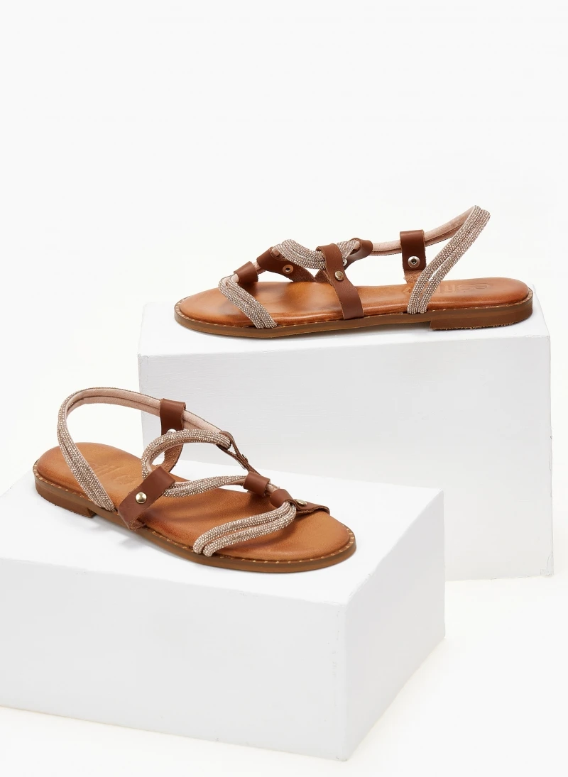Σανδάλια δερμάτινα ESTIL με διπλή σειρά strass. Έχουν λεπτομέρεια μεταλλικό χρώμα περιμετρικά της σόλας. Δερμάτινος πάτος με ενίσχυση. Ελληνικής κατασκευής.