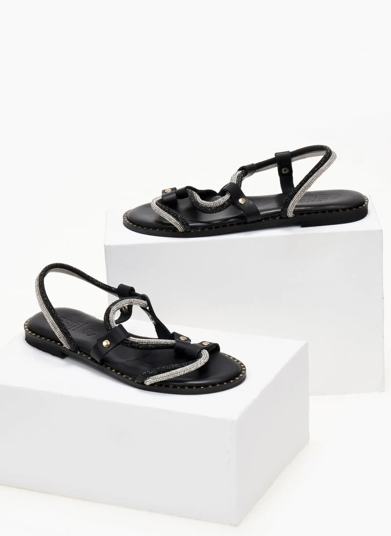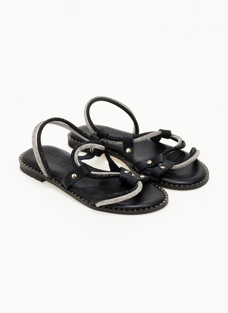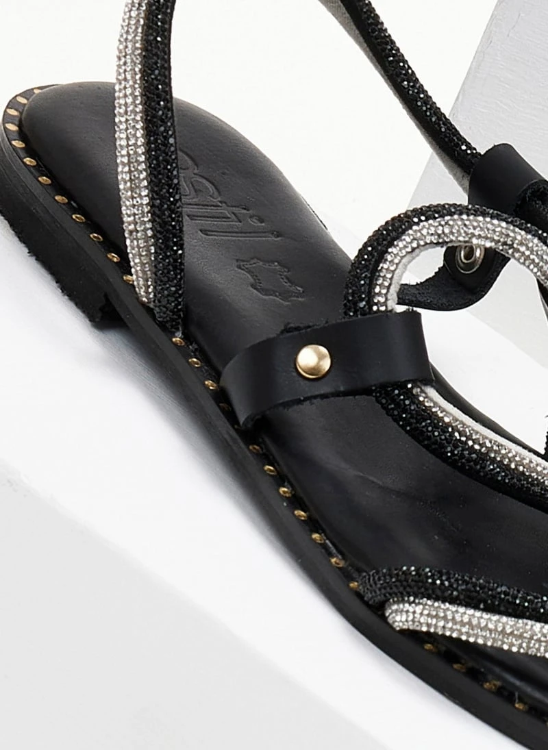 Σανδάλια δερμάτινα ESTIL με διπλή σειρά strass. Έχουν λεπτομέρεια μεταλλικό χρώμα περιμετρικά της σόλας. Δερμάτινος πάτος με ενίσχυση. Ελληνικής κατασκευής.