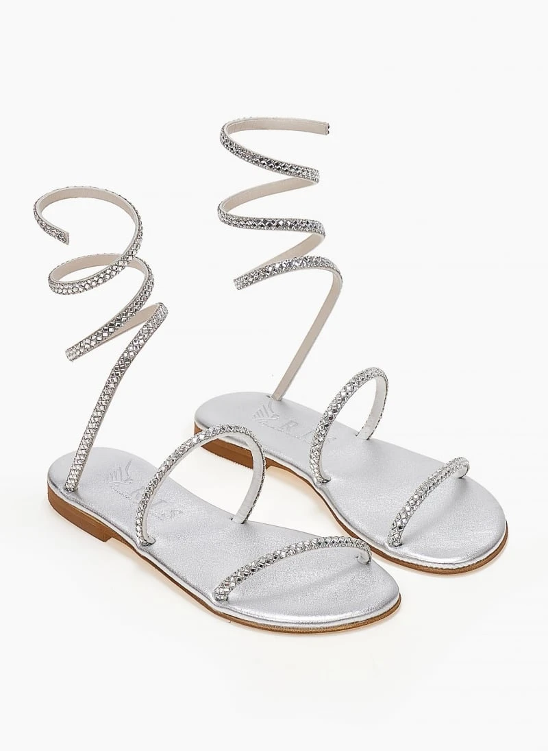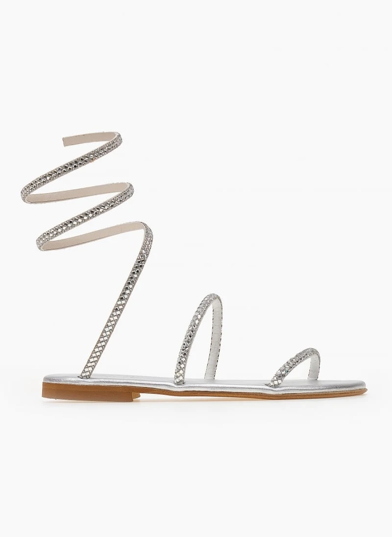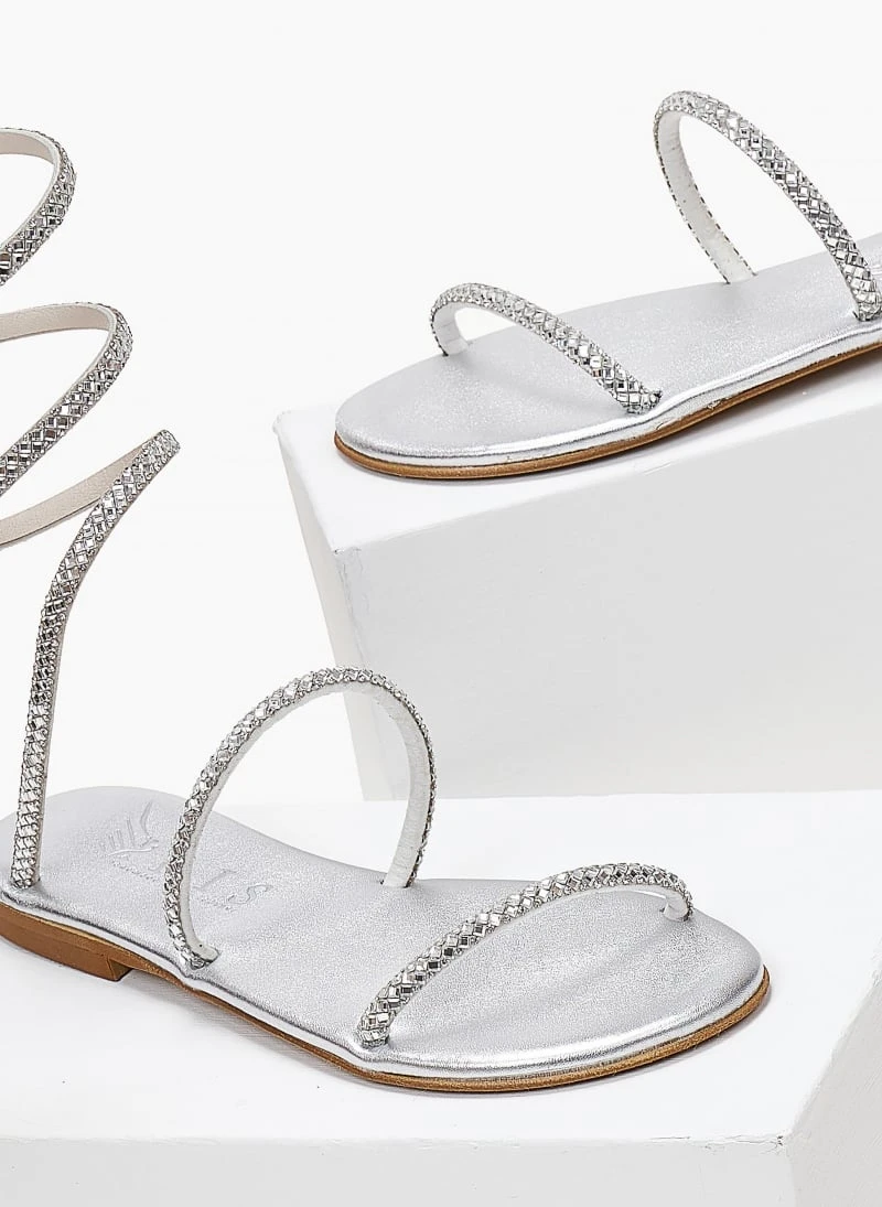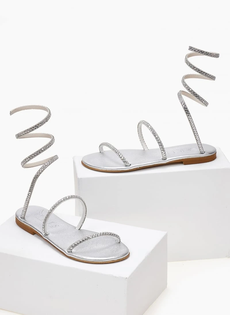 Σανδάλια δερμάτινα IRIS με κρύσταλλα. Έχουν λεπτά λουράκια. Δέσιμο σπιράλ στο ύψος της γάμπας. Δερμάτινος πάτος με ενίσχυση. Ελληνικής κατασκευής,χειροποίητα.