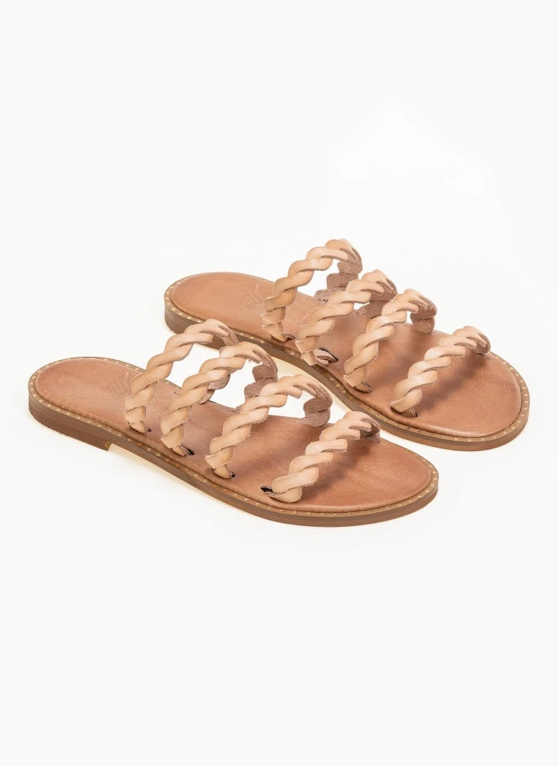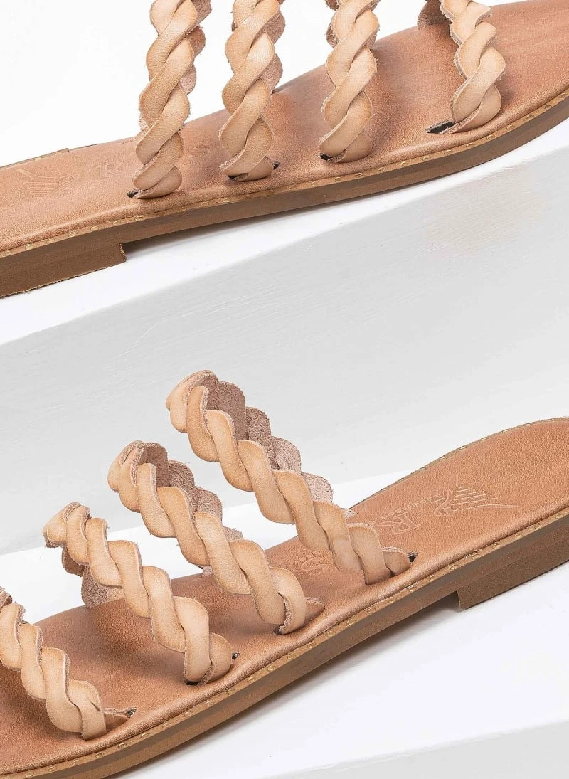 Δερμάτινα φλατ σανδάλια με πλεγμένα λουράκια. Ο πάτος είναι δερμάτινος με ενίσχυση. Έχουν λεπτομέρεια μεταλλικό χρώμα περιμετρικά της σόλας. Ελληνικής κατασκευής, χειροποίητα.