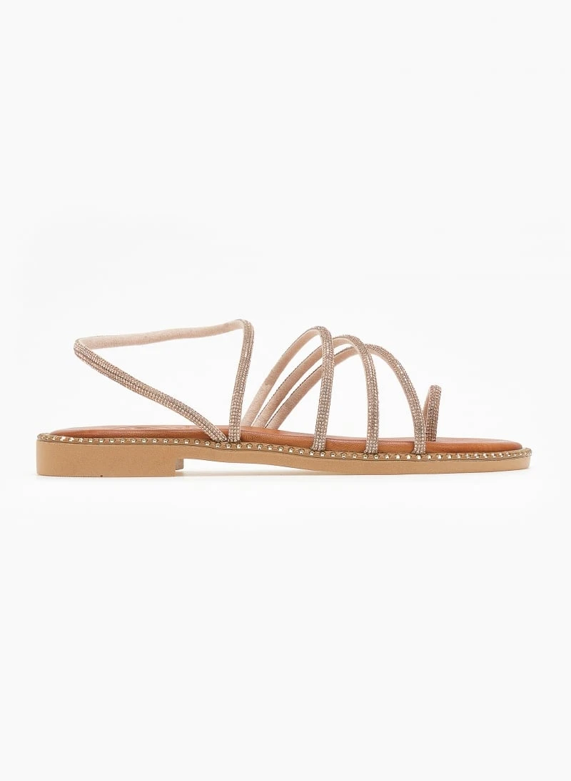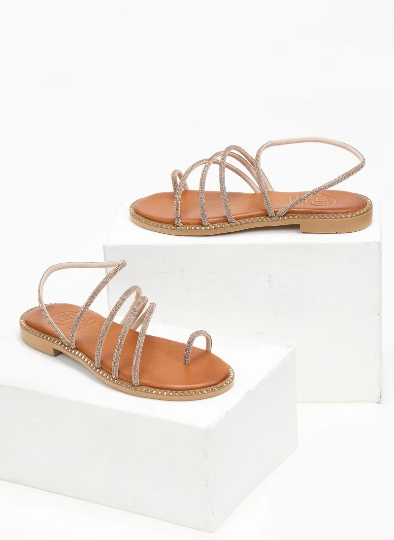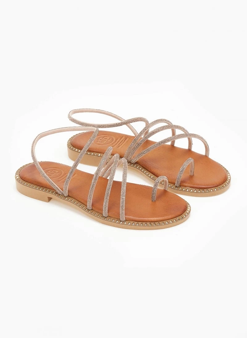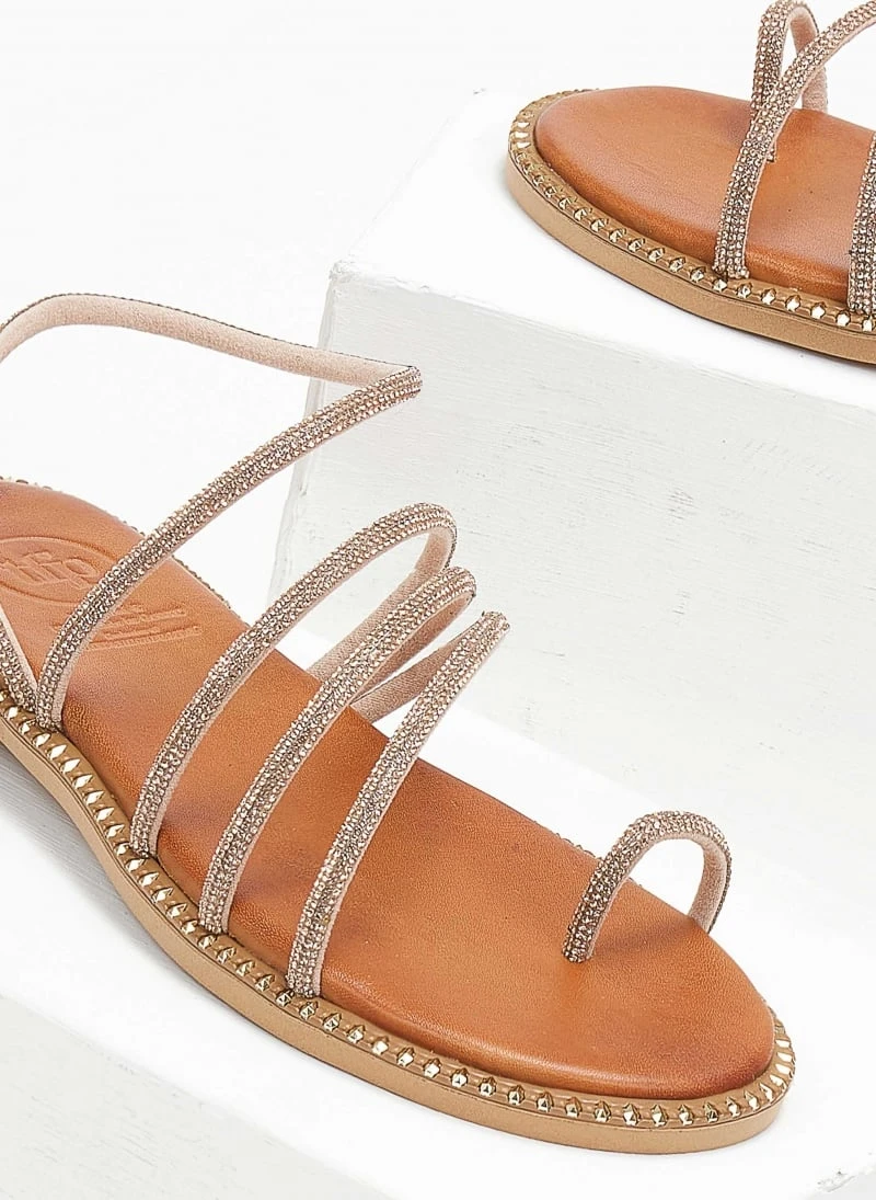 Tfp δερμάτινα σανδάλια με στρας λουράκια. Έχουν μαλακό δερμάτινο πάτο με ενίσχυση. Περαστό strass λουράκι στο ύψος του αστραγάλου. Τα λουράκια είναι λοξά. Ελληνικής κατασκευής.