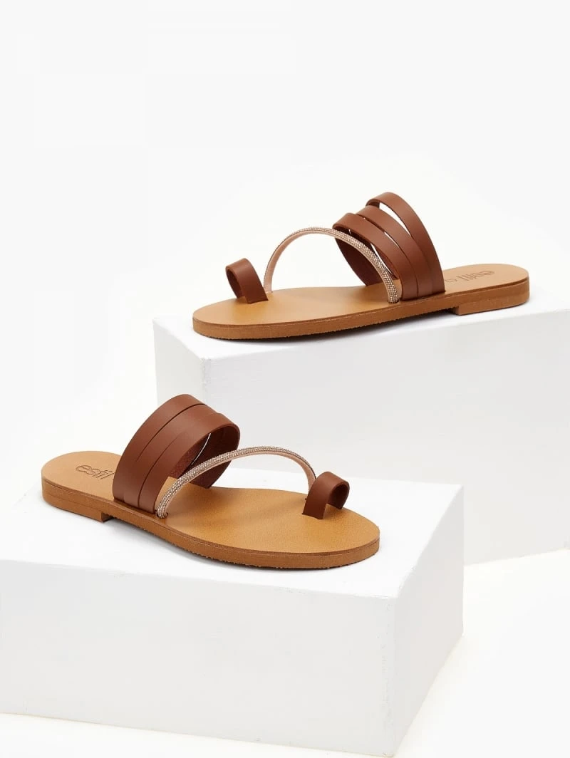 Σανδάλια δερμάτινα ESTIL. Έχουν λοξό strass λουράκι στο κουτεπιέ. Ελληνικής κατασκευής.