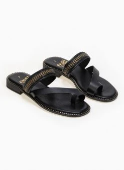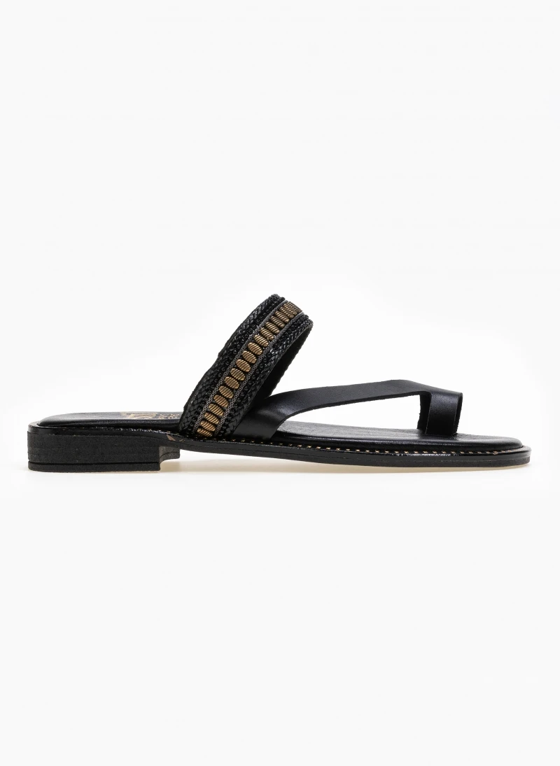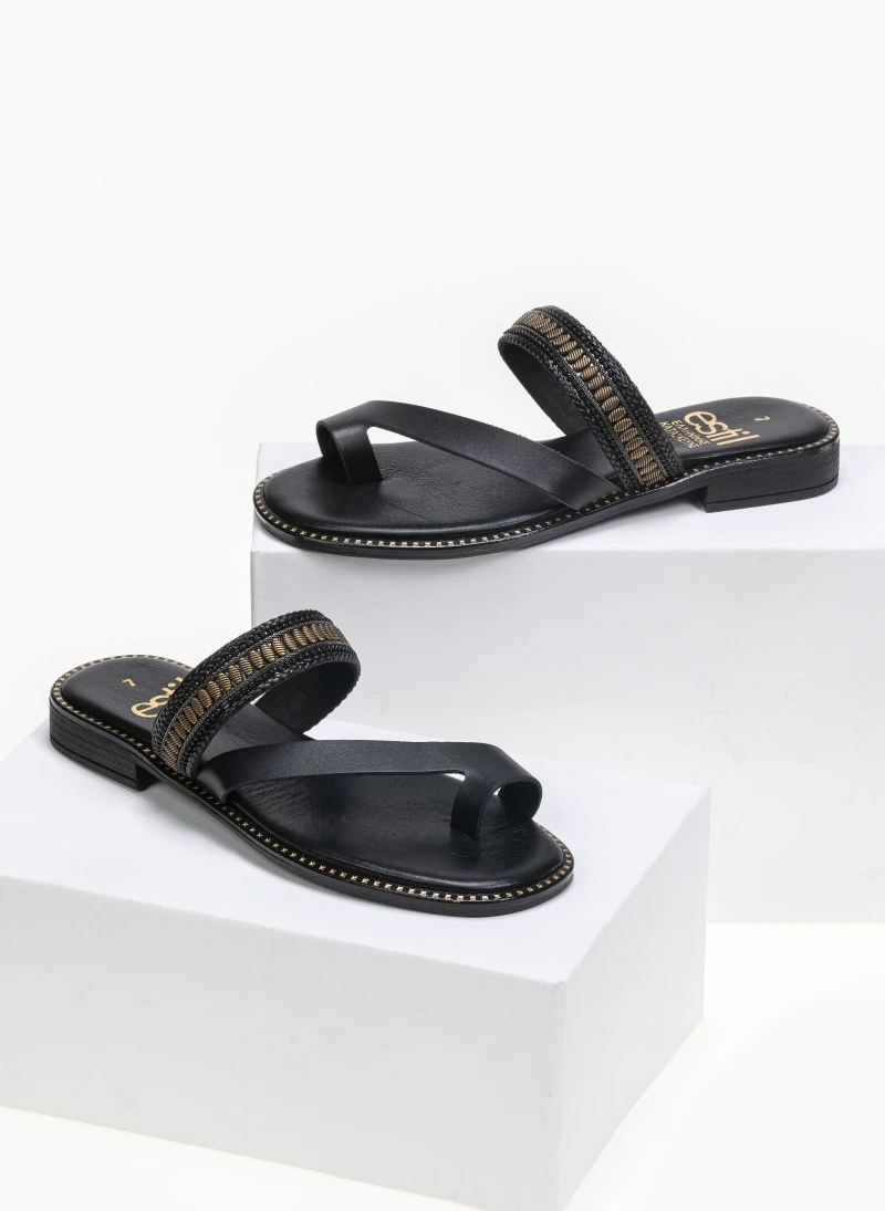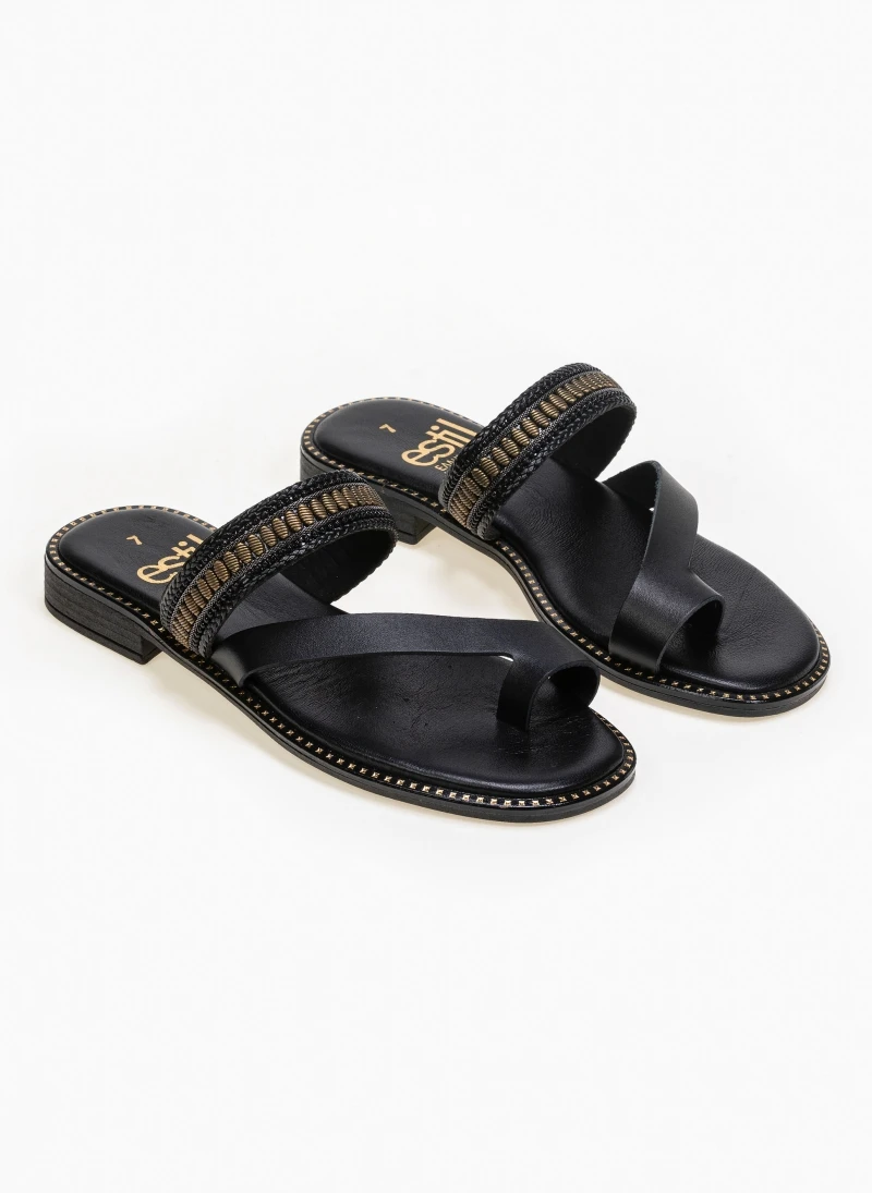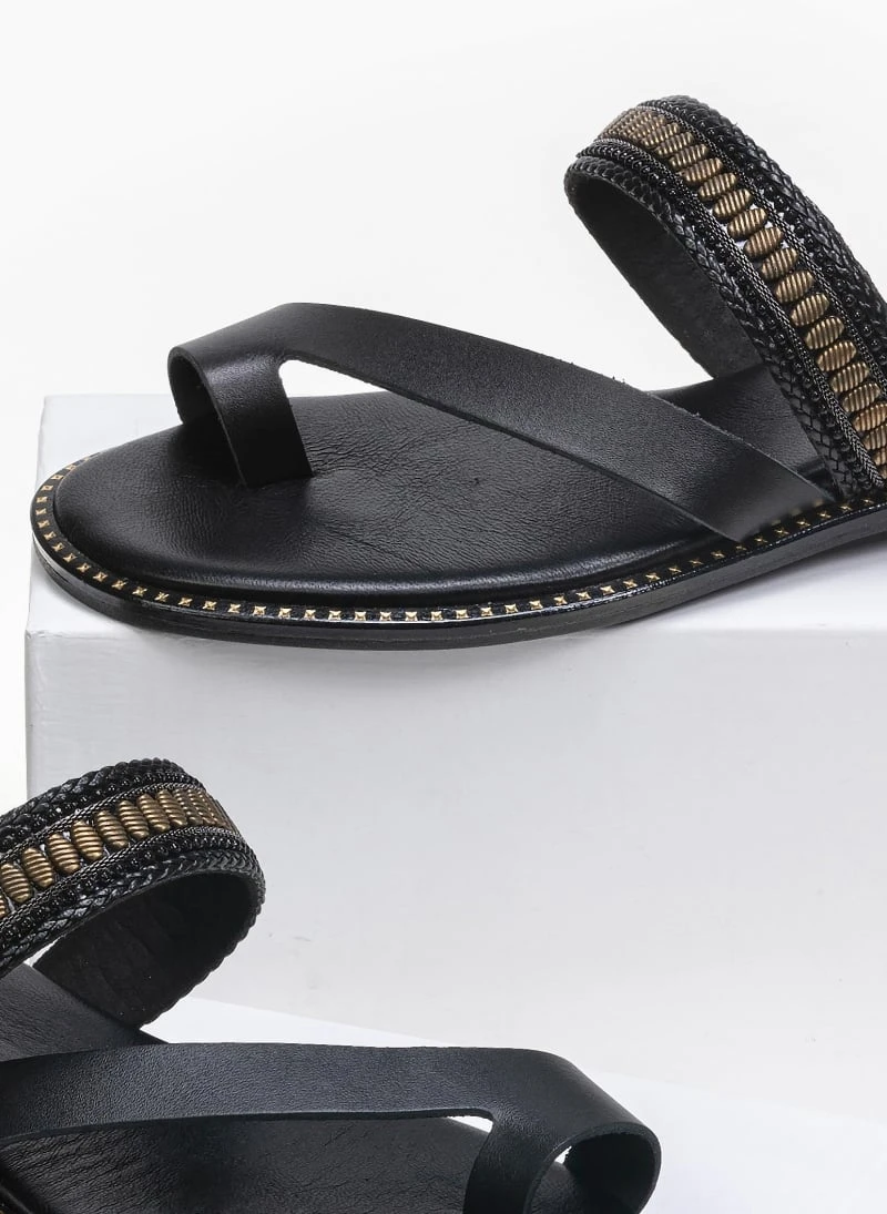 Estil φλατ δερμάτινα σανδάλια με boho σχέδιο στη φάσα. Έχουν λεπτομέρεια σε μεταλλικό χρώμα περιμετρικά της σόλας. Ο πάτος είναι δερμάτινος με ενίσχυση για μεγαλύτερη άνεση. Ελληνικής κατασκευής.