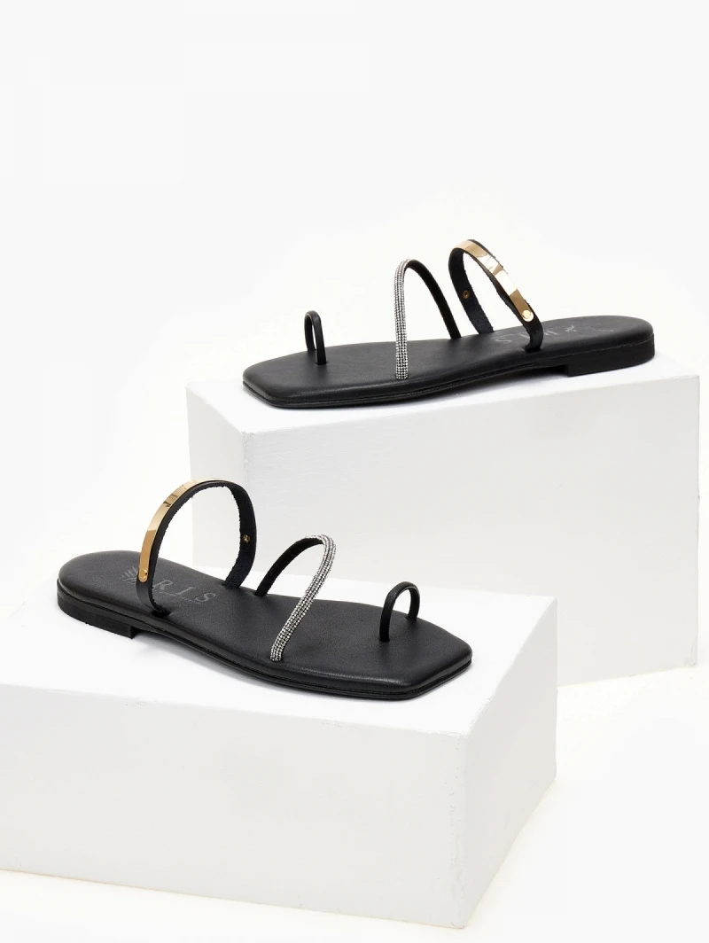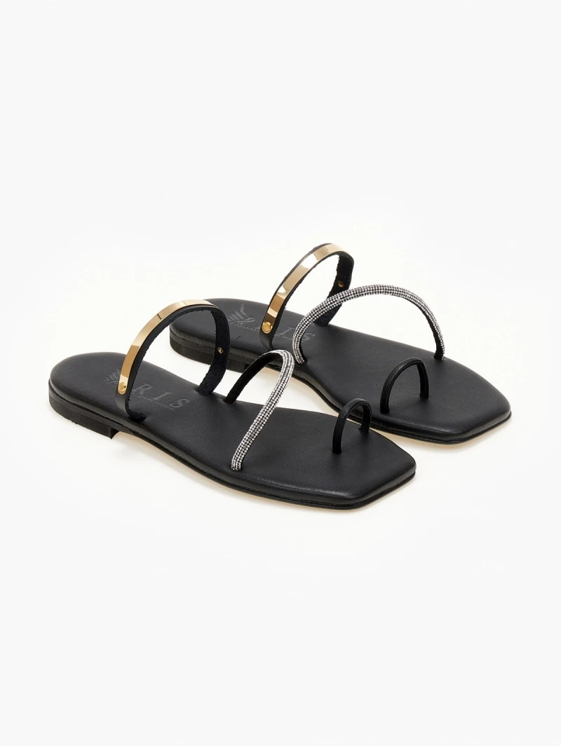 Σανδάλια δερμάτινα IRIS με λεπτή σειρά strass και μεταλλική λεπτομέρεια. Δερμάτινος πάτος με ενίσχυση. Ελληνικής κατασκευής,χειροποίητα.