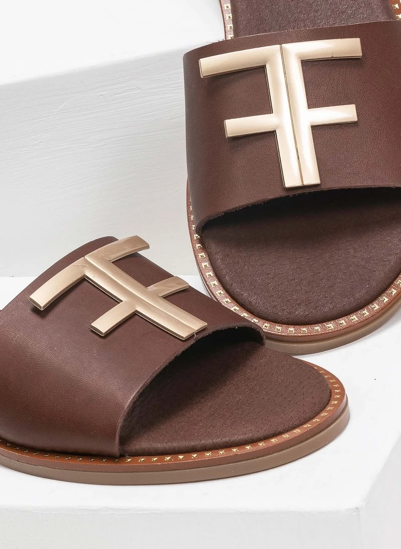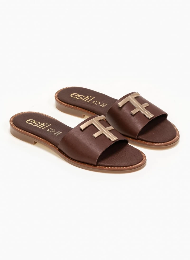 Estil δερμάτινα σανδάλια με φάσα και μεταλλικό διακοσμητικό. Ο πάτος είναι δερμάτινος με ενίσχυση. Έχουν μαλακή σόλα. Ελληνικής κατασκευής.