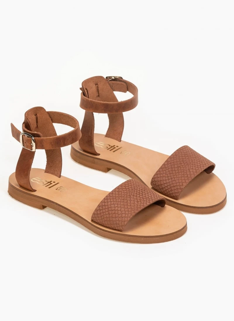 Tfp δερμάτινα ίσια πέδιλα με pattern φίδι. Δένουν με μπαρέτα στο ύψος του αστραγάλου. Ελληνικής κατασκευής, χειροποίητα.