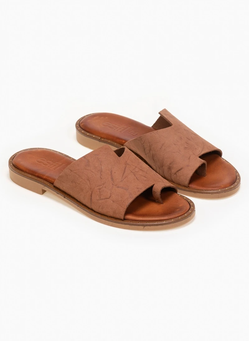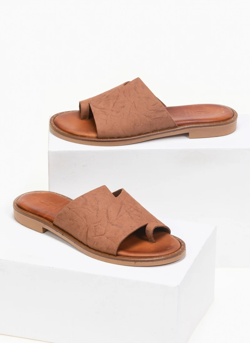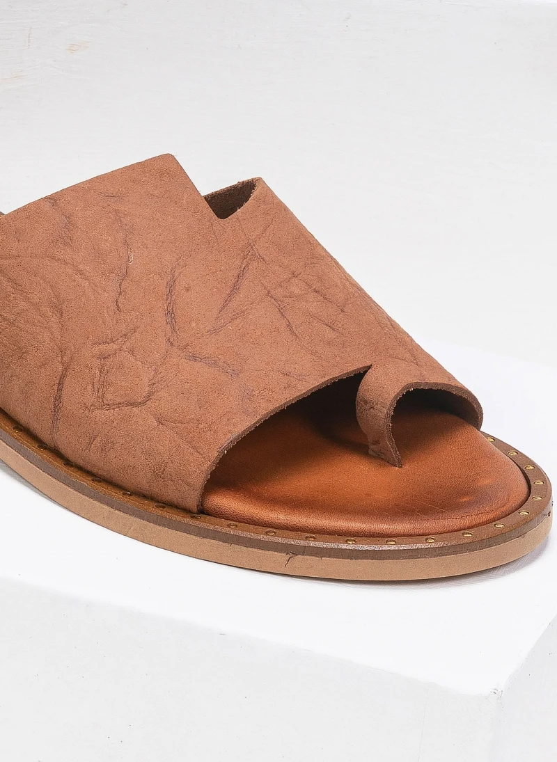 Estil δερμάτινα σανδάλια με φαρδιά φάσα και pattern τσαλακωτό. Έχουν μαλακό δερμάτινο πάτο με ενίσχυση. Ελληνικής κατασκευής, χειροποίητα.