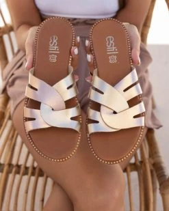 Estil δερμάτινα σανδάλια με περαστές φάσες. Έχουν δερμάτινο πάτο με ενίσχυση. Η σολα είναι μαλακή από λάστιχο και έχει λεπτομέρειες σε χρυσό χρώμα. Ελληνικής κατασκευής, χειροποίητα.