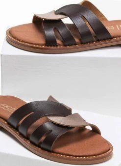Estil δερμάτινα σανδάλια με περαστές φάσες. Έχουν δερμάτινο πάτο με ενίσχυση. Η σολα είναι μαλακή από λάστιχο και έχει λεπτομέρειες σε χρυσό χρώμα. Ελληνικής κατασκευής, χειροποίητα.