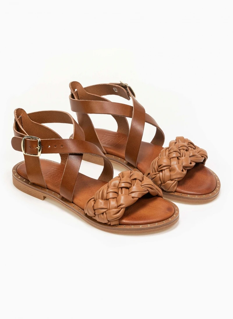 Estil δερμάτινα φλατ πέδιλα με πλεκτή φάσα. Έχουν μαλακό δερμάτινο πάτο με ενίσχυση. Δένουν στο πλάι με λουράκι. Ελληνικής κατασκευής.