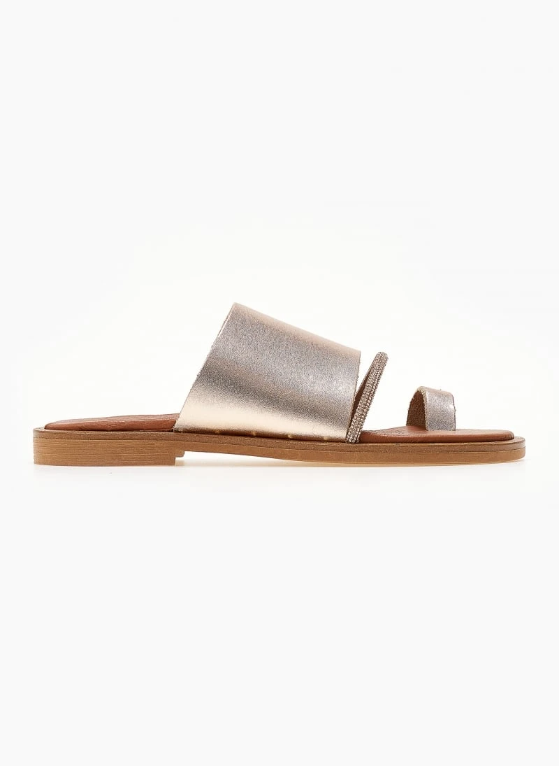 ESTIL δερμάτινα σανδάλια με φαρδιά φάσα. Έχουν λεπτή σειρά strass. Λεπτομέρεια σε μεταλλικό χρώμα περιμετρικά της σόλας. Δερμάτινος πάτος με ενίσχυση. Ελληνικής κατασκευής.