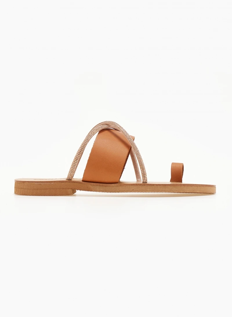 Σανδάλια δερμάτινα ESTIL. Έχουν λεπτή φάσα με χιαστί strass λουράκια στο ύψος του κουτεπιέ. Γνήσιο δέρμα. Ελληνικής κατασκευής.