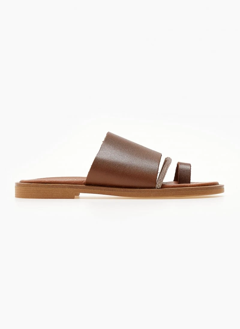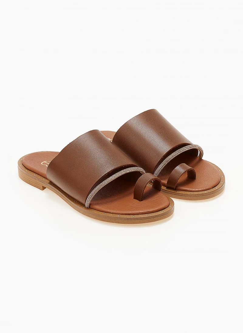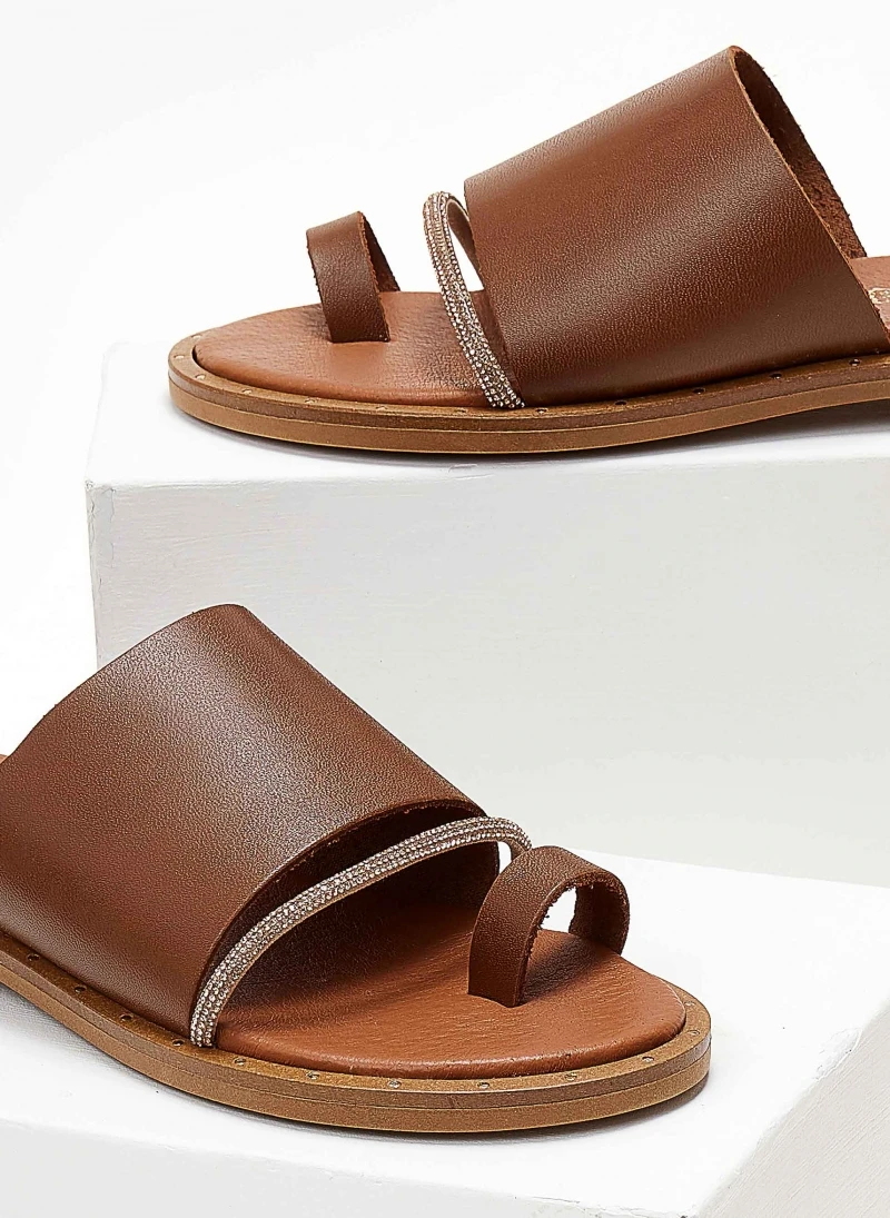 ESTIL δερμάτινα σανδάλια με φαρδιά φάσα. Έχουν λεπτή σειρά strass. Λεπτομέρεια σε μεταλλικό χρώμα περιμετρικά της σόλας. Δερμάτινος πάτος με ενίσχυση. Ελληνικής κατασκευής.