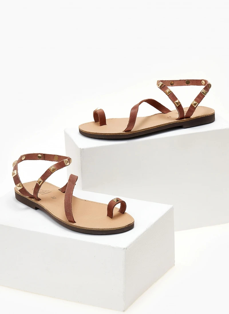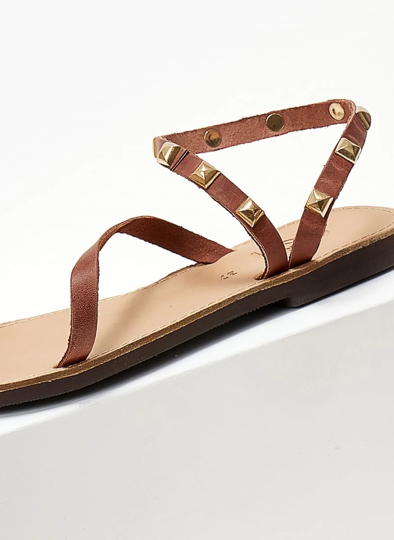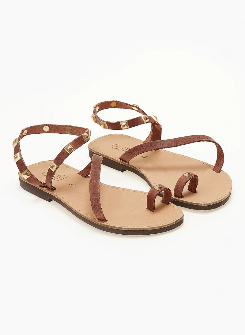 Estil δερμάτινα ίσια πέδιλα με περαστό λουράκι στον αστράγαλο. Ο πάτος είναι δερμάτινος με ενίσχυση. Ελληνικής κατασκευής, χειροποίητα.