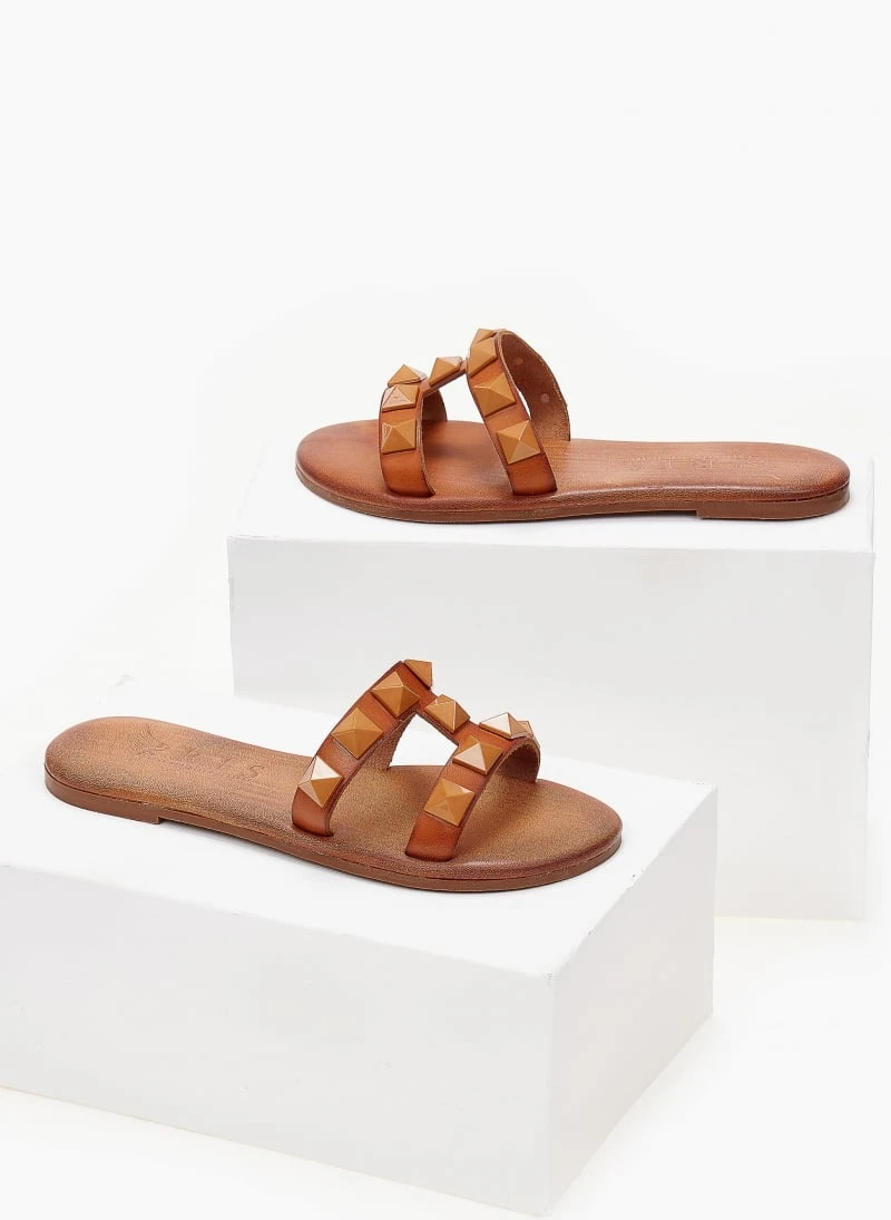 Δερμάτινα φλατ σανδάλια IRIS με μεγάλα τρουκς. Χειροποίητα,ελληνικής κατασκευής.