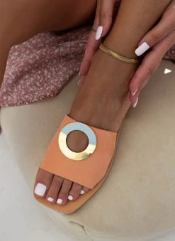 Σανδάλια από nubuck δέρμα με φαρδιά φάσα. Έχουν μεταλλικό στοιχείο με άνοιγμα σε σχήμα κύκλο. Δερμάτινος πάτος. Ελληνικής κατασκευής,χειροποίητα.