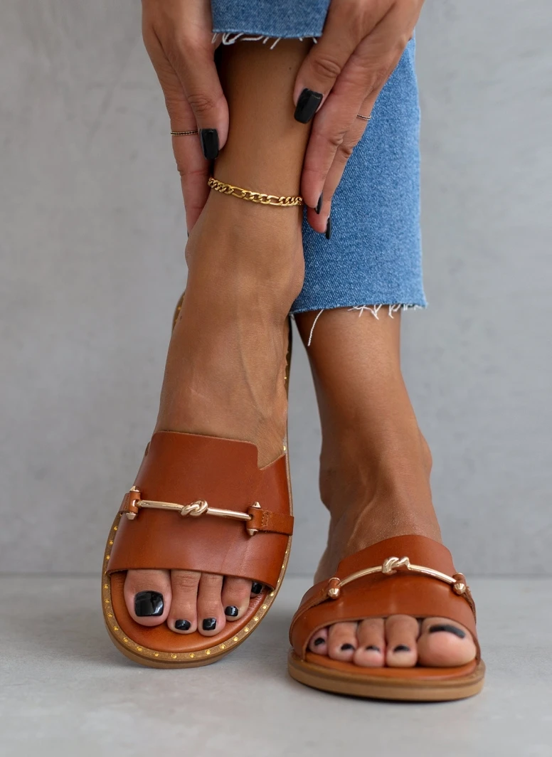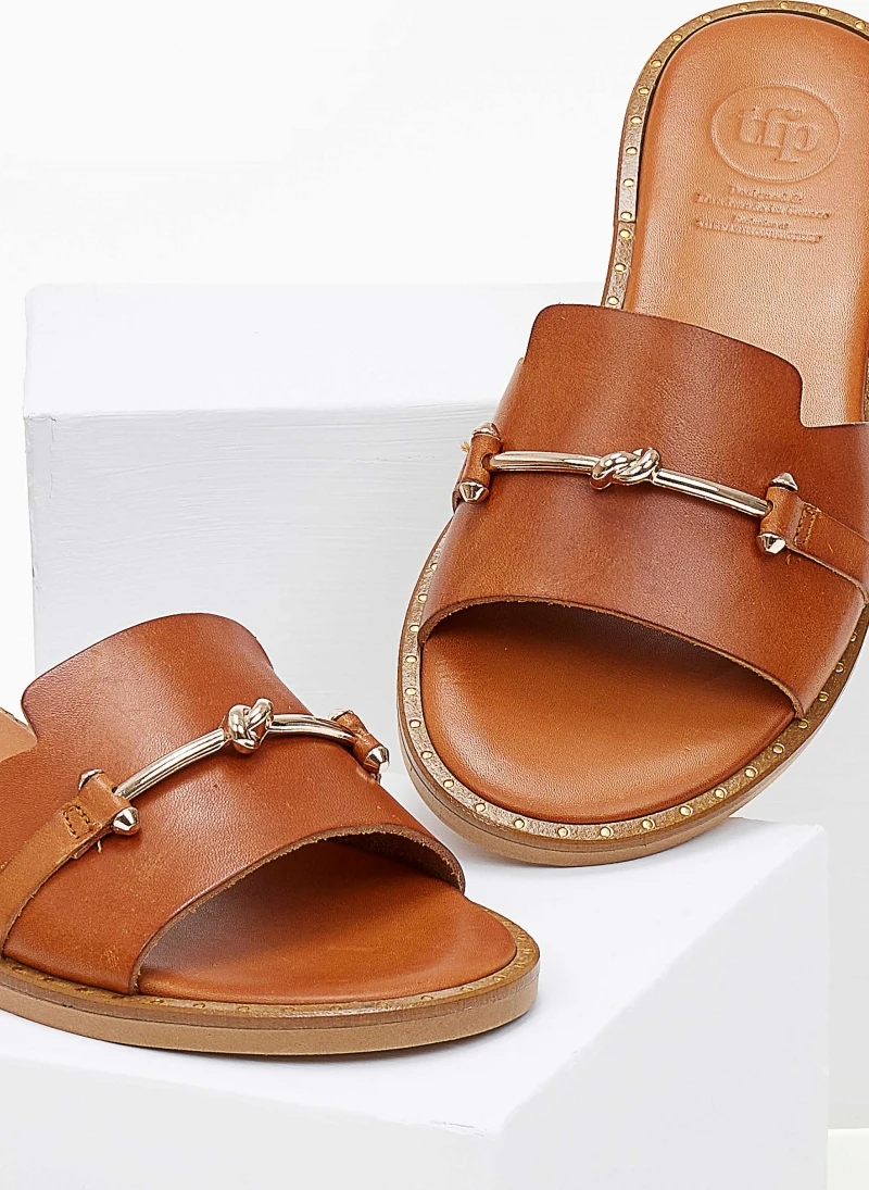 TFP δερμάτινα σανδάλια με φαρδιά φάσα και μεταλλική αλυσίδα σε χρυσό χρώμα. Έχει μαλακό πάτο. Έλληνικής κατασκευής.