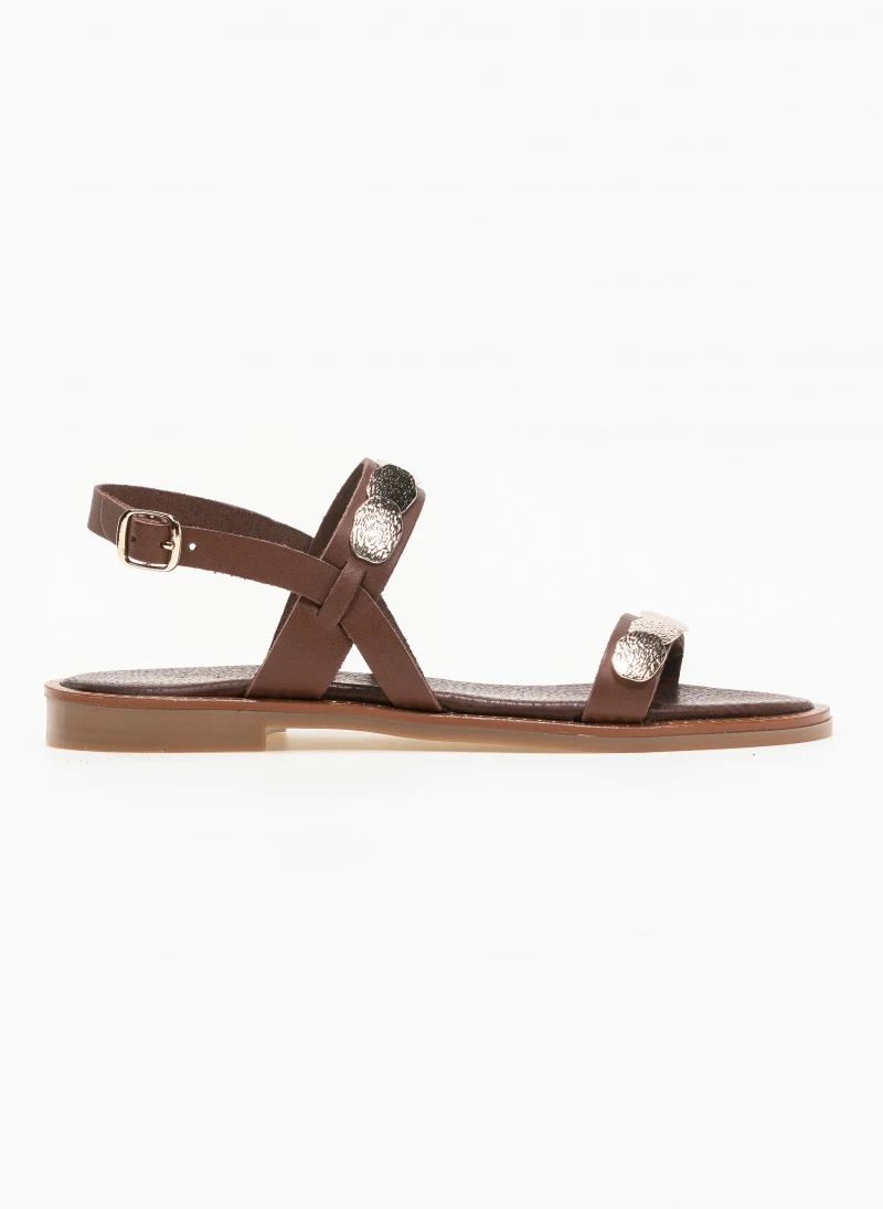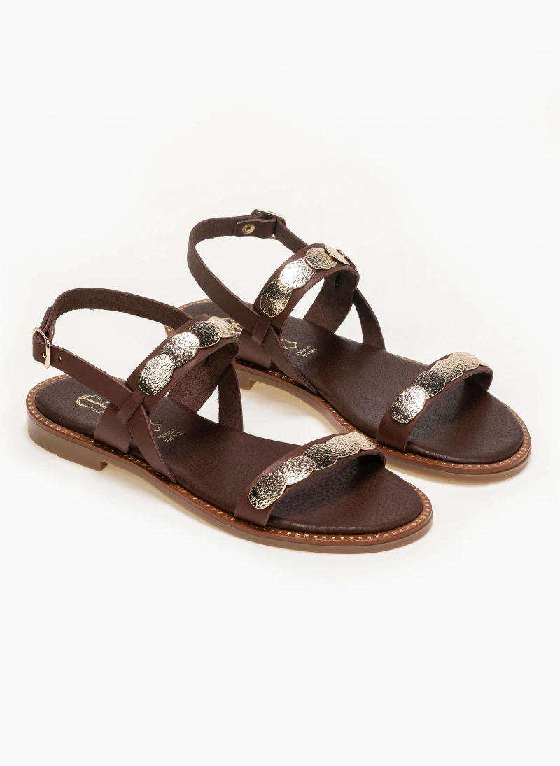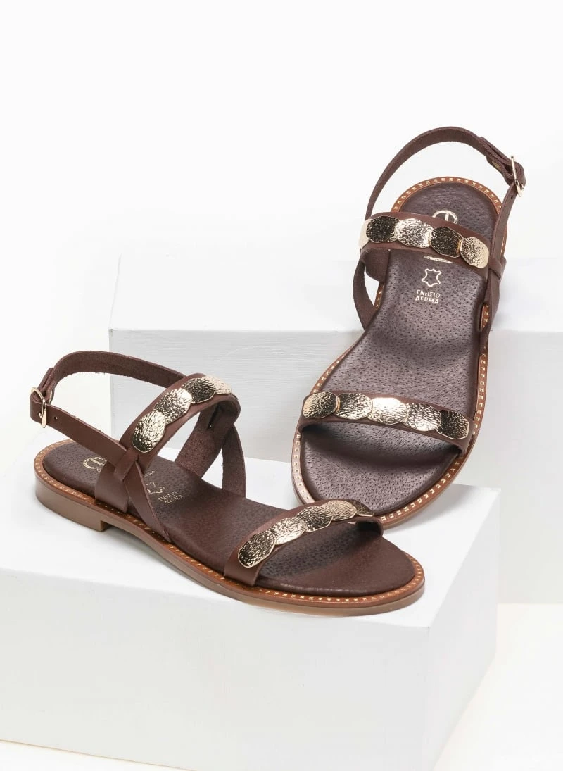 Estil δερμάτινα ίσια πέδιλα με δύο λουράκια και μεταλλικά στοιχεία. Δένουν στο πλάι. Ο πάτος είναι δερμάτινος με ενίσχυση. Ελληνικής κατασκευής.