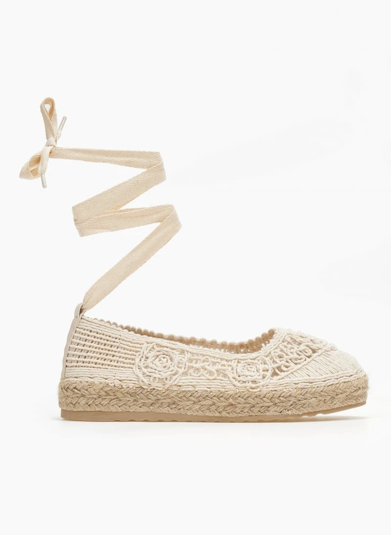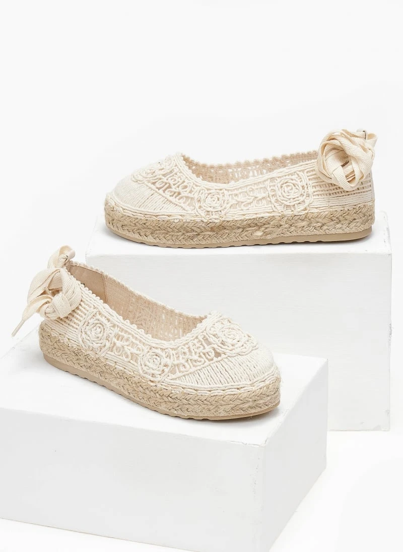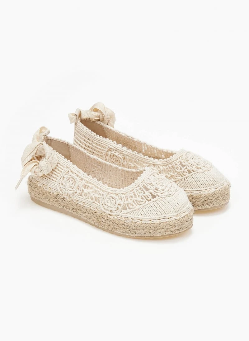 Εσπαντρίγιες με πλεκτό σχέδιο από σχοινί. Δένουν με κορδόνι στη γάμπα. Σχοίνινη σόλα.