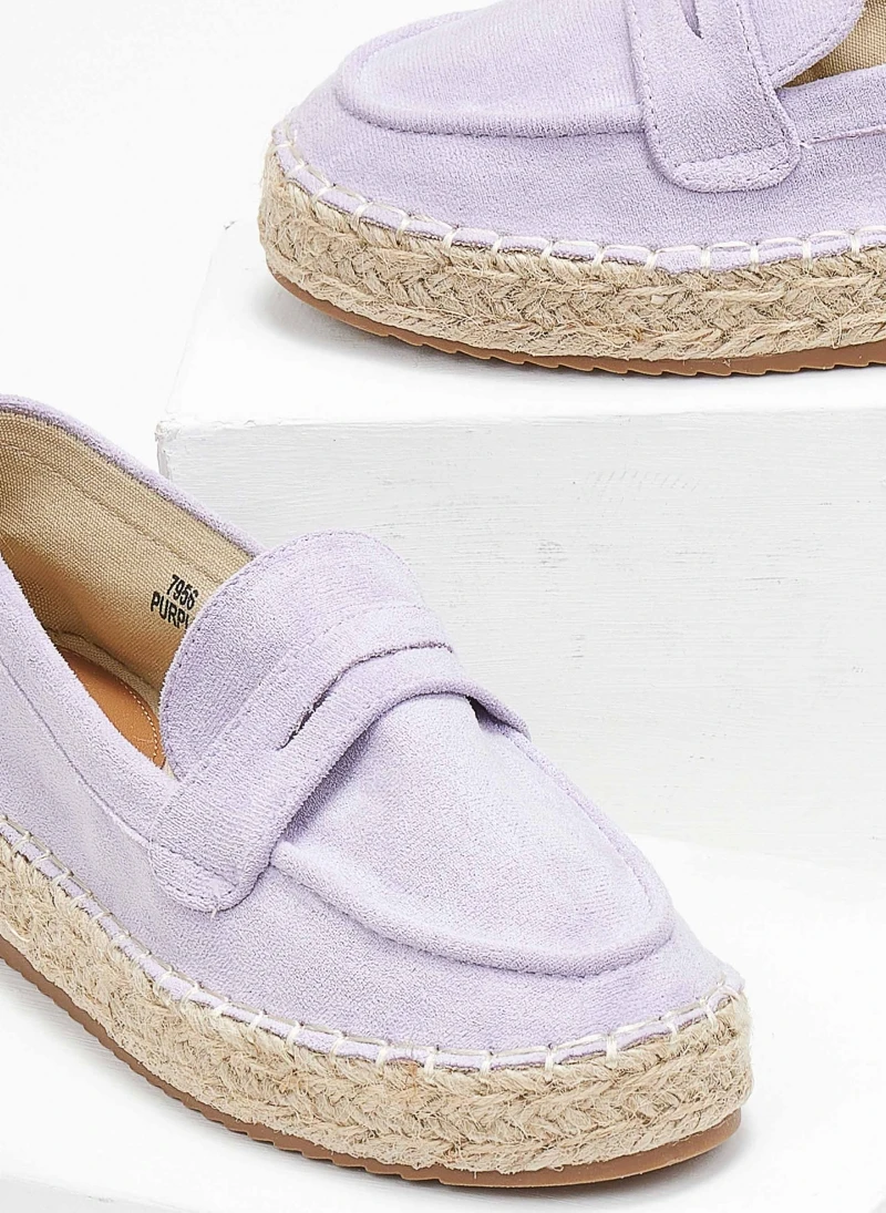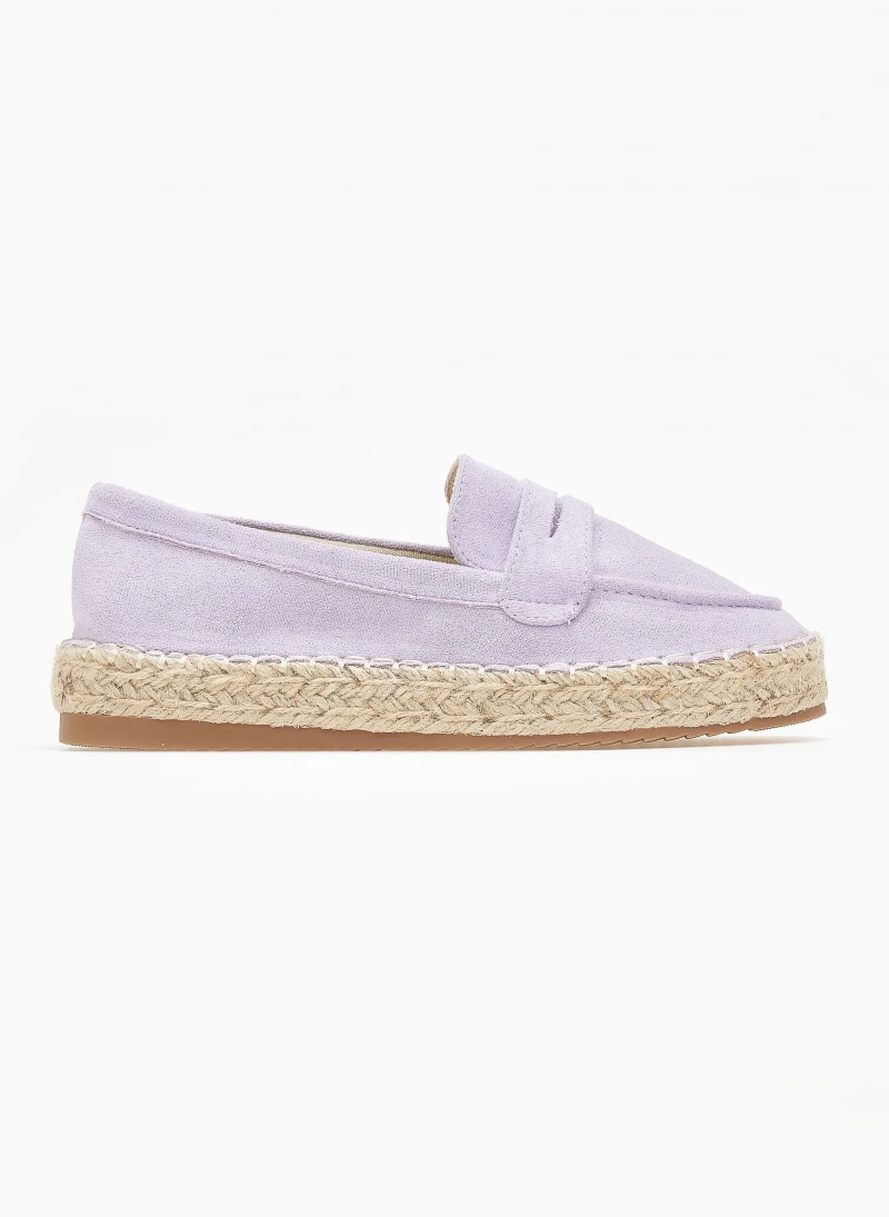 Εσπαντρίγιες suede σε σχέδιο loafer. Έχουν εξωτερική ραφή στη μπροστινή πλευρά. Σόλα από σχοινί.
