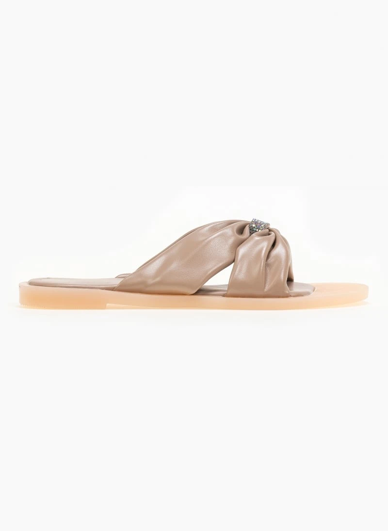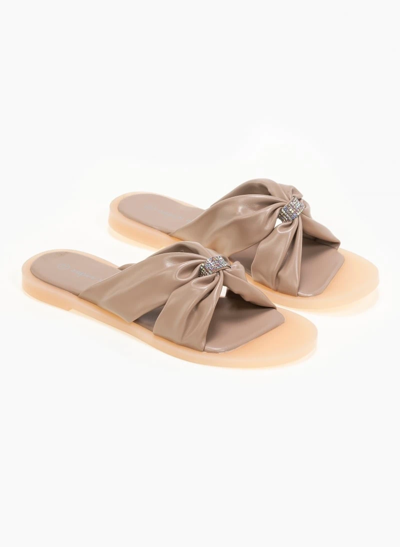 Σανδάλια φλατ με μαλακές τσαλακωτές φάσες και strass διακοσμητικό. Η σόλα είναι μαλακή από λάστιχο.