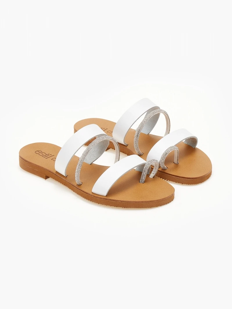 ESTIL δερμάτινα σανδάλια με τρείς φάσες. Έχουν λεπτή σειρά strass στή μεσαία φάσα και στο δάχτυλο. Γνήσιο δέρμα. ΄Ελληνικής κατασκευής.