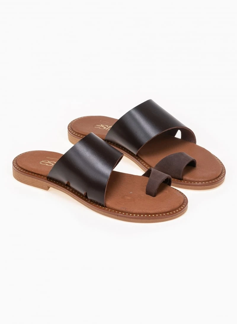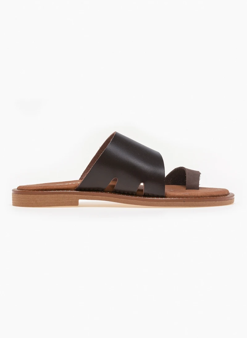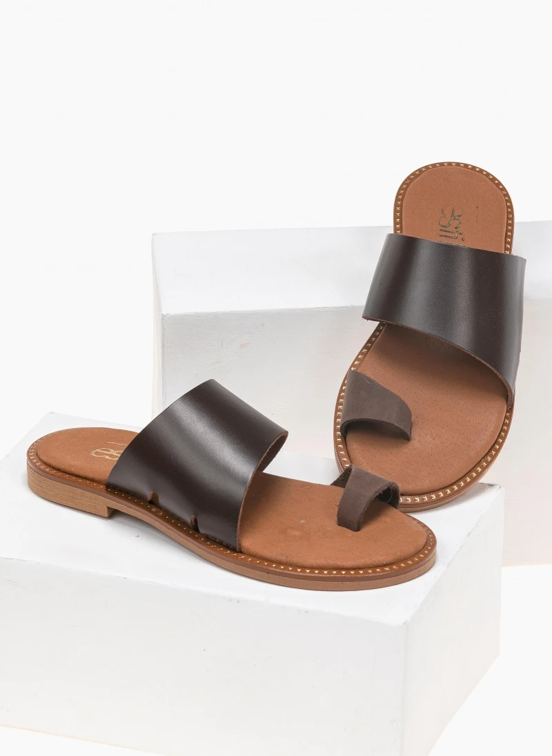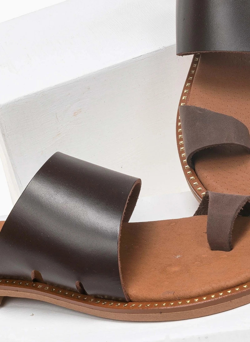 Estil δερμάτινα σανδάλια με λοξή φάσα με ανοίγματα. Ο πάτος είναι δερμάτινος με ενίσχυση. Έχουν λεπτομέρεια μεταλλικό χρώμα περιμετρικά της σόλας. Ελληνικής κατασκευής.