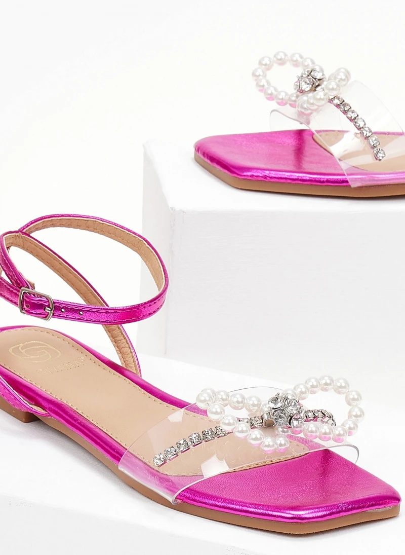 Σανδάλια διαφάνεια με διακοσμητικό φιόγκο με πέρλες και strass. Δένουν με μπαρέτα στο ύψος του αστραγάλου. Kαρέ γραμμή.